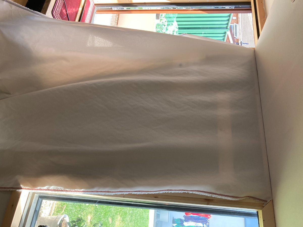 I decided to change the way I was going to finish the room, as my attempt to make panels from thin wood, wrapped in material and then held to the studs had not worked well, and instead staple the material directly to the stud and cover the staples with thin strips of wood.