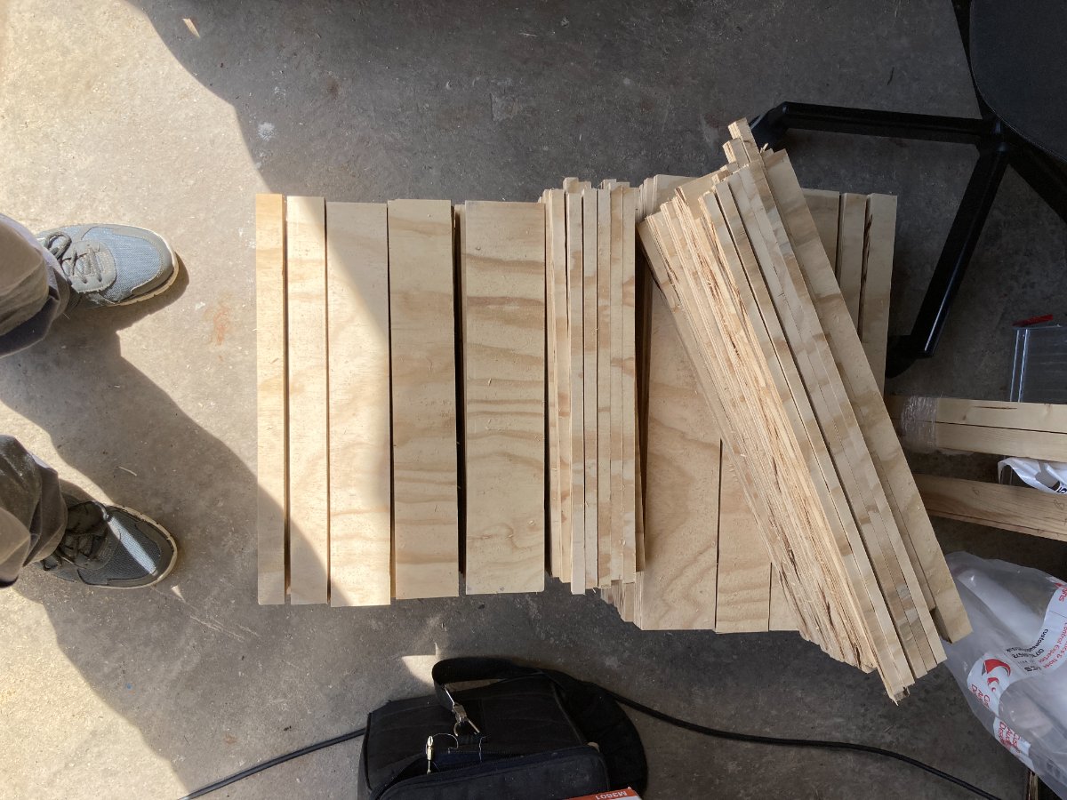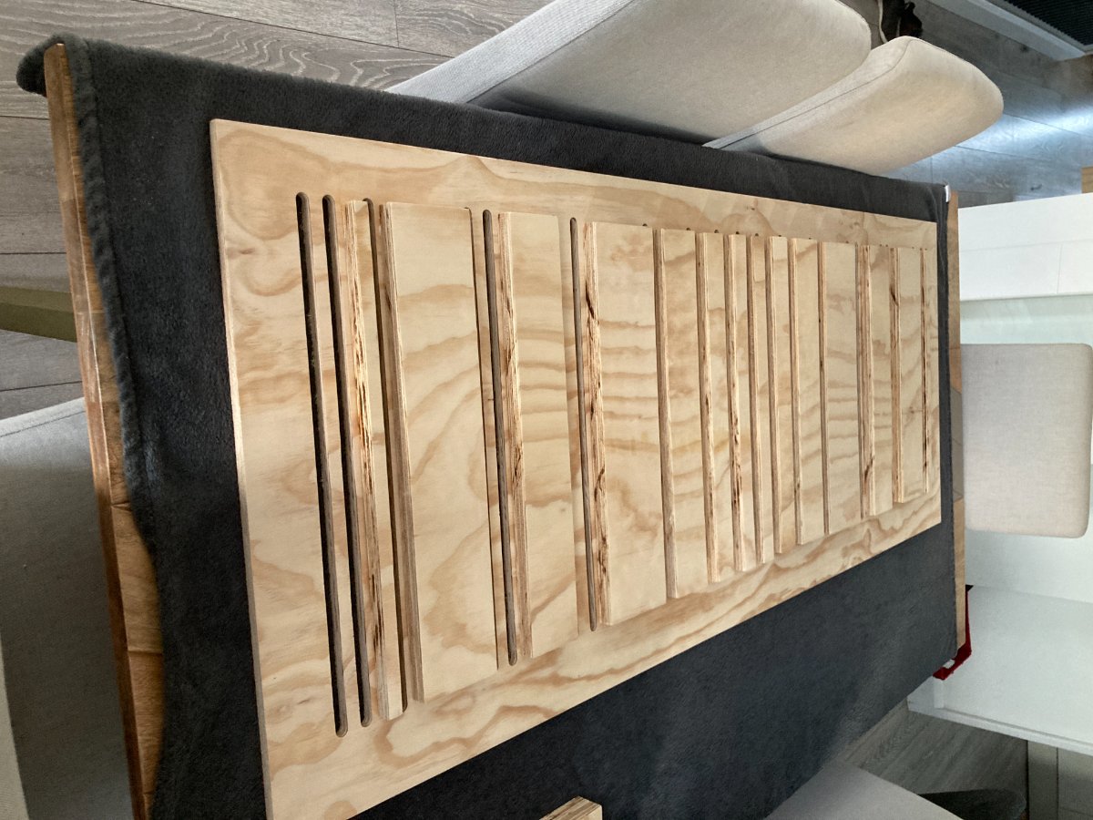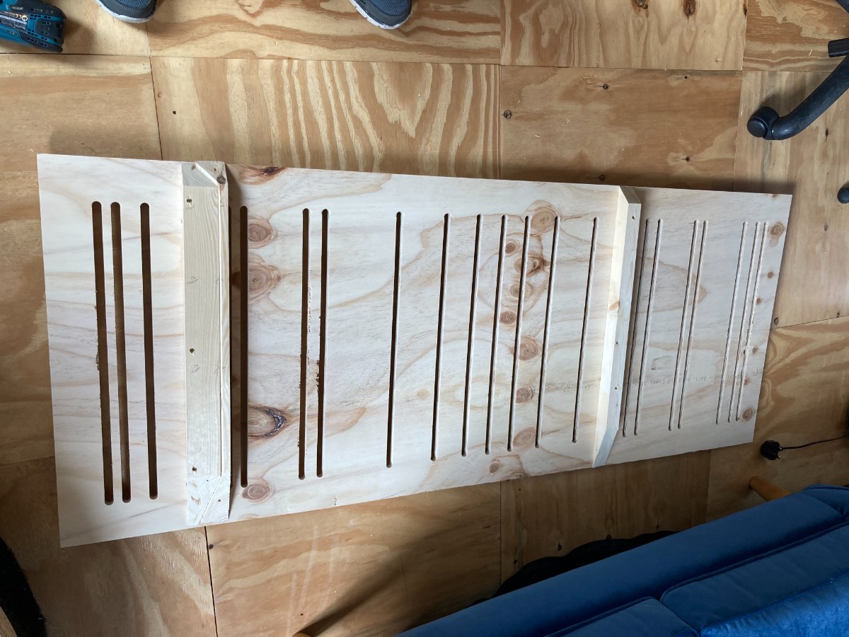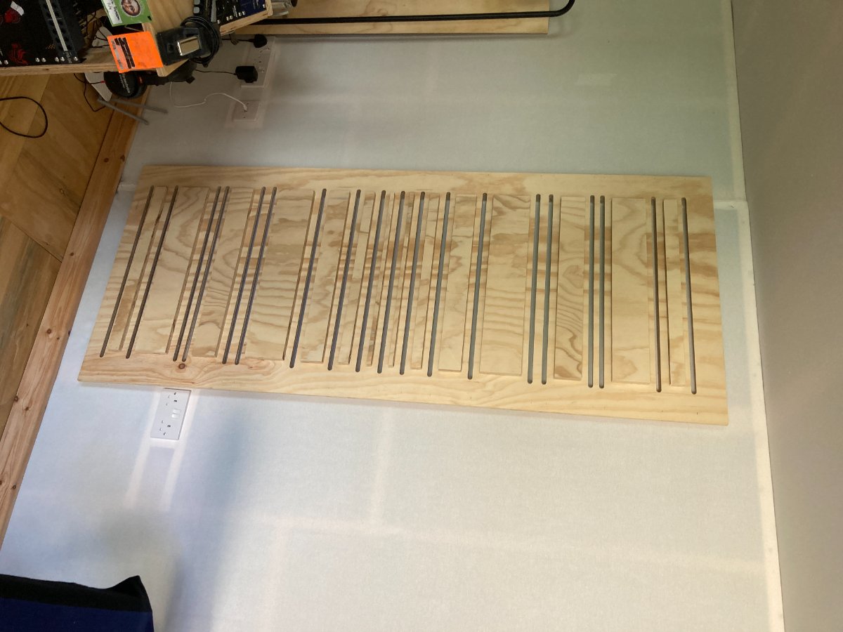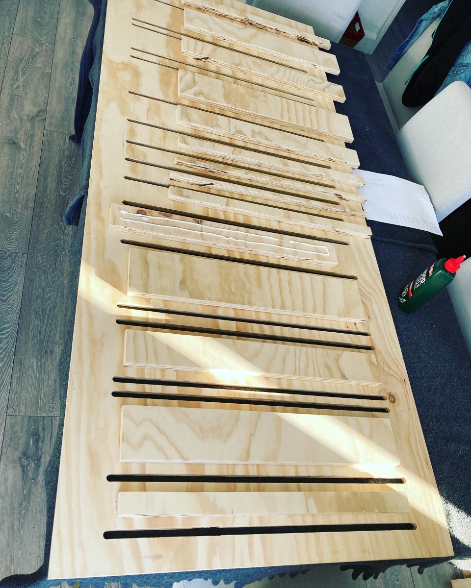 From routing the slots, I then took my 18mm strips which needed sanding to remove rough edges etc (about one hour per panel’s worth) and then finally these could be glued to the panel.