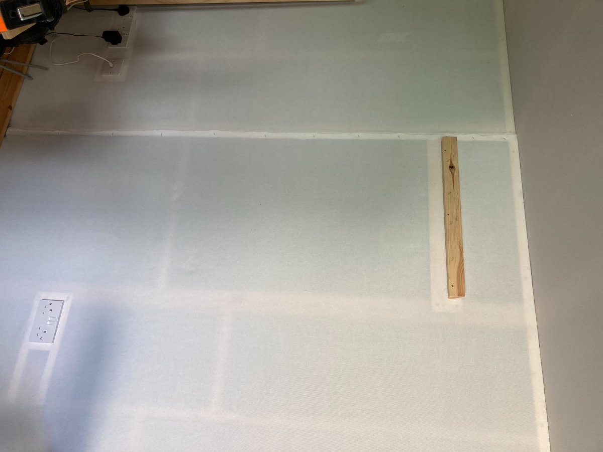 I knew from making my previous material frames from 18mm x 28mm wood that it didn’t bend much, so figured I could make a H frame slightly smaller than the panel, and glue and screw it to the back of the panel. Thankfully this worked and also provided something to screw through when mounting the flush panel to the ceiling joists. I’d taken a risk and not added support beams for both edges of this panel, hoping that I could screw one long length of it to a ceiling joist that ran across the width of the room and the other long length of the panel just at the mid point, to the pair of joists that run down the middle of my ceiling (my ceiling is a series of H shaped joists.