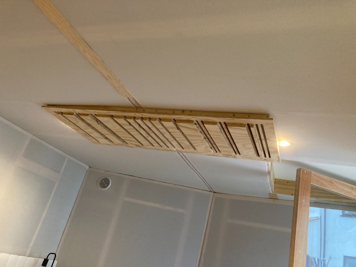 I added some 2x3 across the ceiling bays to provide something strong to screw hooks in that could take the weight of flown reflective panels: