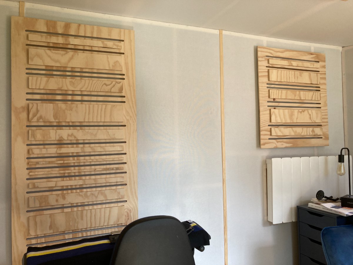 The panels comprised a piece of 12mm plywood with slots routed in at predetermined spacings, with 18mm thick plywood sections of predetermined sizes glued to the front, to both look good and create an element of diffusion.