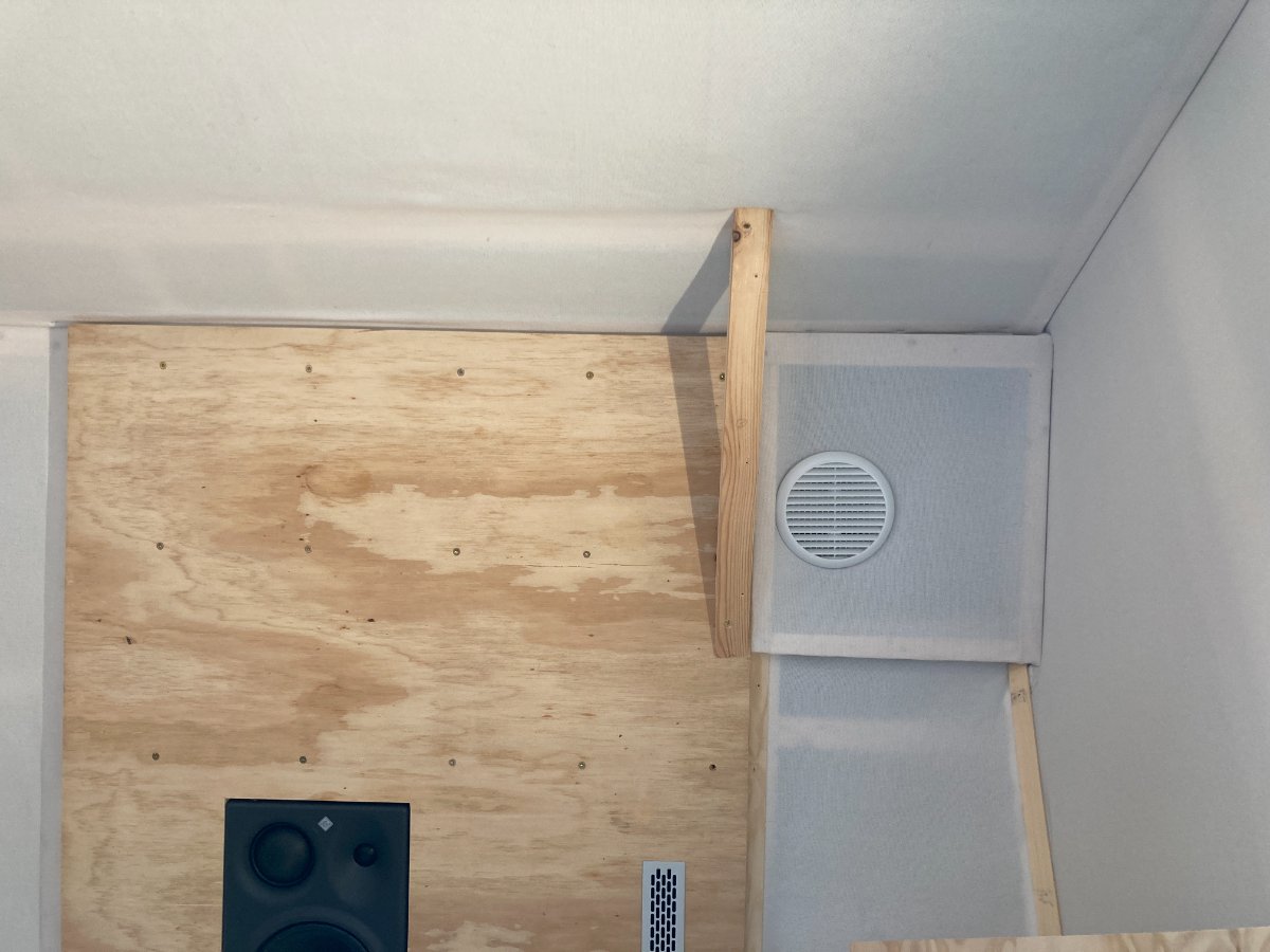 Before I describe what was added to the room, I’ll recap to explain what the room had by way of treatment already. The soffit walls had hangers underneath the shelf, and rockwool stuffed in the cavity above the soffit front – this can be seen in my last pictures in my previous post.