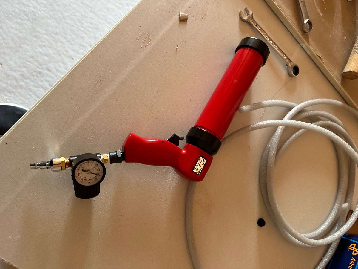 Pneumatic caulking gun acquired. Also, pneumatic caulking gun explosion. Pressure was a tad too high. Lol