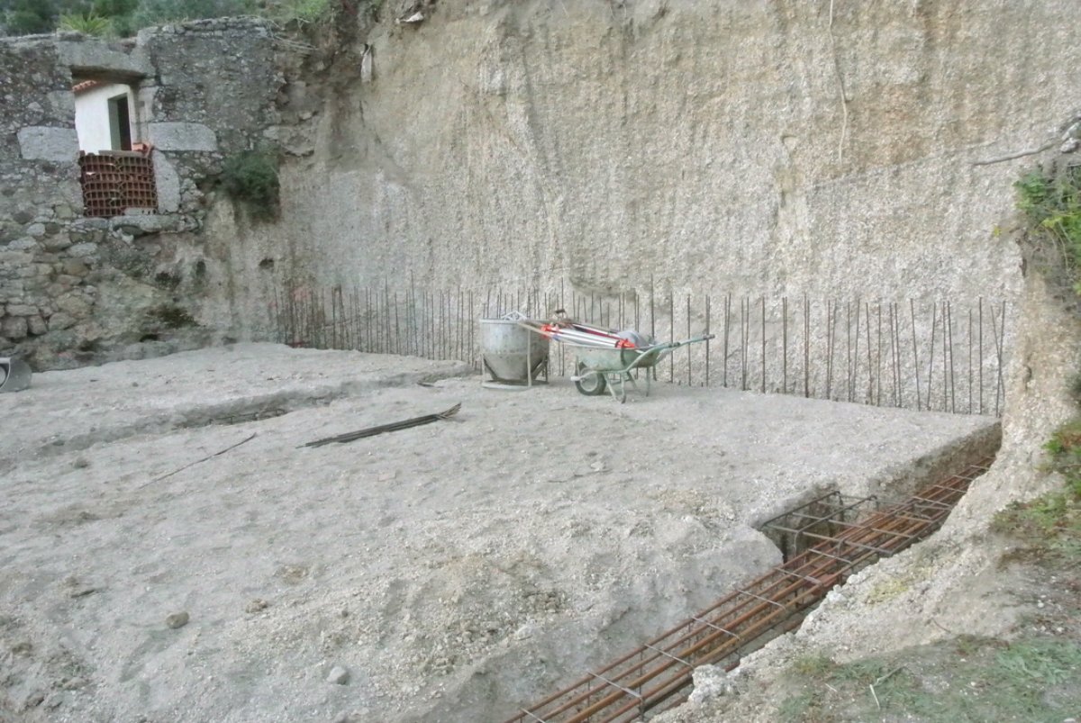 Great weather and Paul and his two helpers did a great job today. The corner of the ruin was cut off, the foundations for that side of the building cut dug out, the kiwi transplanted, the steel cages for the rear foundation put in place.. Looking good… I took a lot of pictures.
