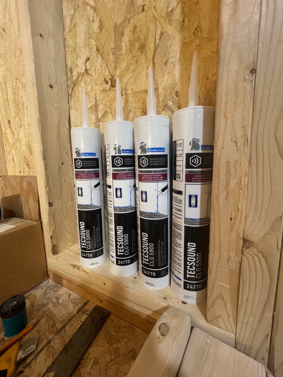 Alrighty! Next step was applying noiseproofing sealant in all the areas where I had any cracks or gaps. I ended up using this product from Soprema. I ended up using roughly 8-10 tubes of this stuff. It's great to work with and washes off easily but I ended up having issues with my caulking gun and had to cut open most of the tubes and scrapping up a good portion of the material and applying it manually.