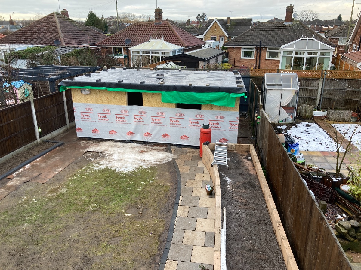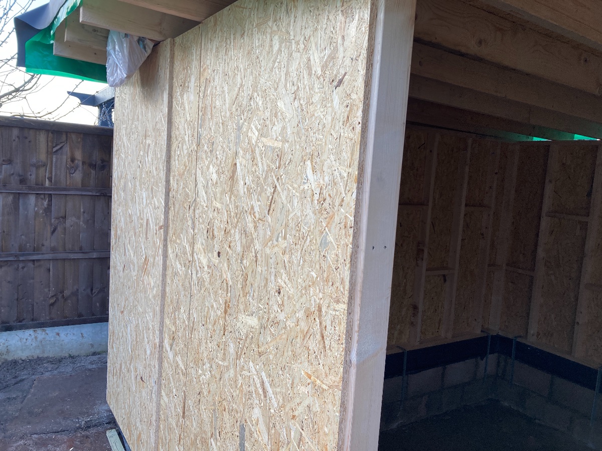 We managed to get the rest of the OSB sheathing on the walls on New Year’s Eve. I went for two layers in the end and although I haven’t caulked the expansion gaps the overlaps are all aligned with upright studs.