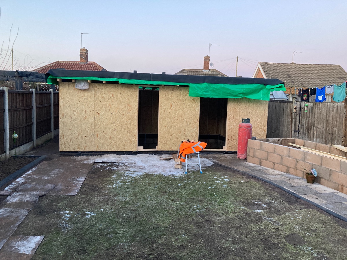 Another busy few days - my partner and I managed to get the vapour barrier, insulation and second layer of OSB on the roof. I caulked all the gaps between the first layer of OSB before this. I used some expensive long screws to go through the whole roof into the joists to hold it all together. Getting the EPDM rubber up on to the roof required us phoning her dad for extra help as it was so very heavy - we nearly didn’t manage. It’s just placed on the roof for now whilst we await warmer weather to glue it down.