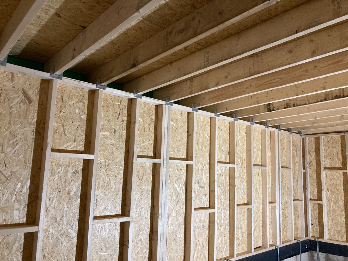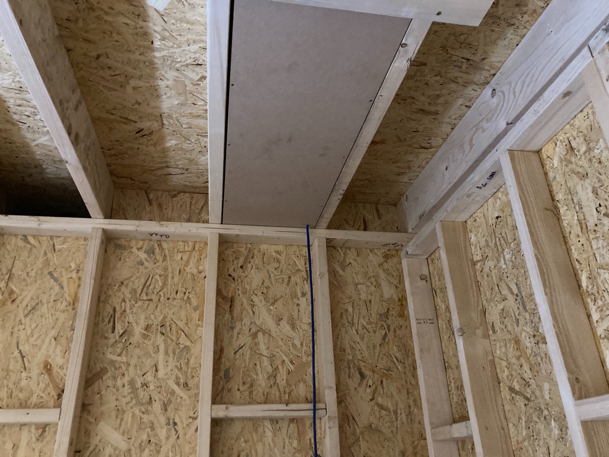 The next jobs are fiddly: I need to cut and install squares of OSB to put in the gaps between the ceiling joists above the walls and add some brackets to hold the joists to the walls better.