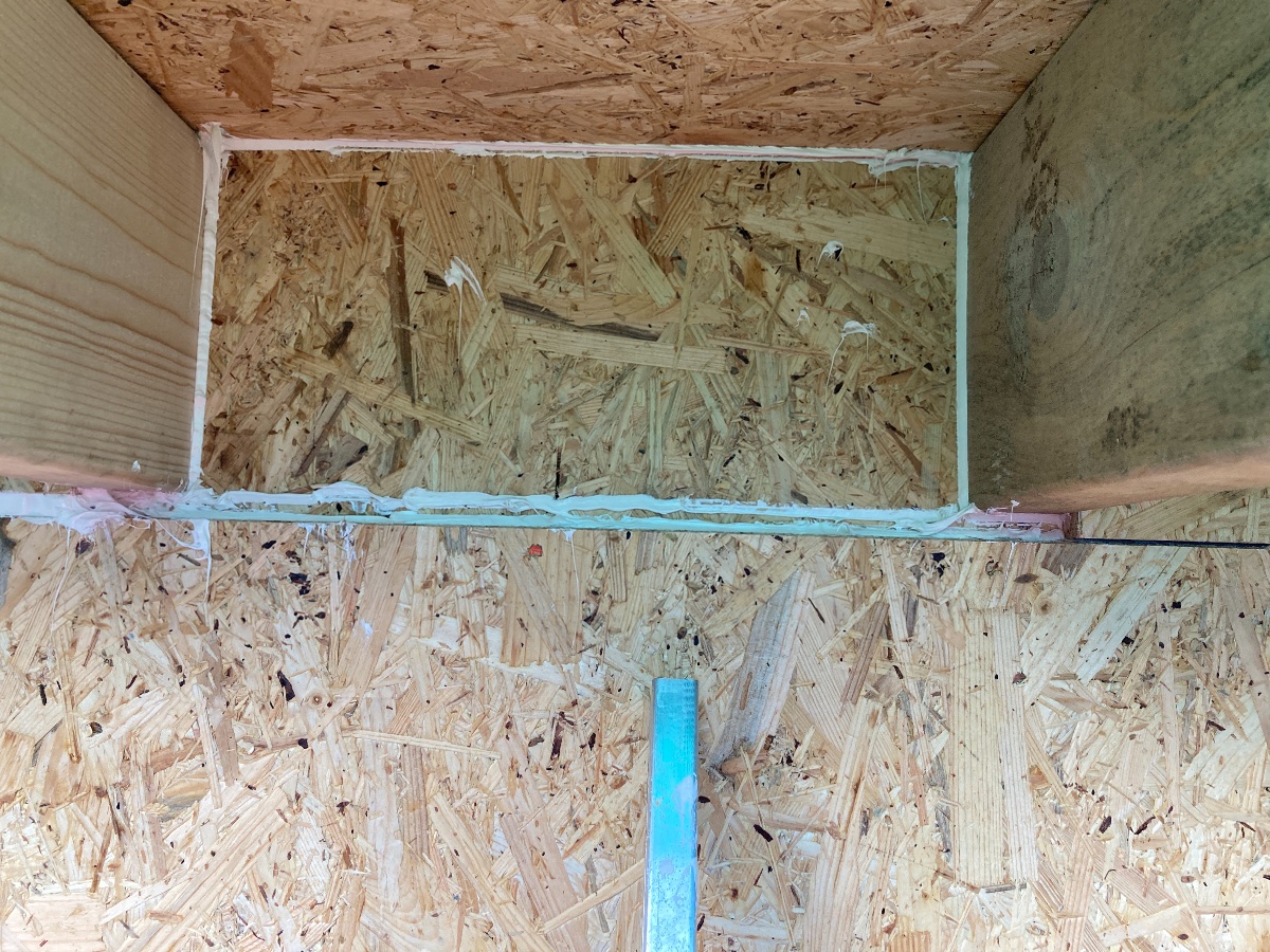 At the front, because there will be a pretty fascia, I am cutting rectangles of OSB to fit between the joists. I tried this in two of the gaps today and decided friction fit with caulk between the two layers would be the best solution. It seemed to work well. I realise I’ve not left an expansion gap here but I hope for such a small piece of OSB it won’t matter.