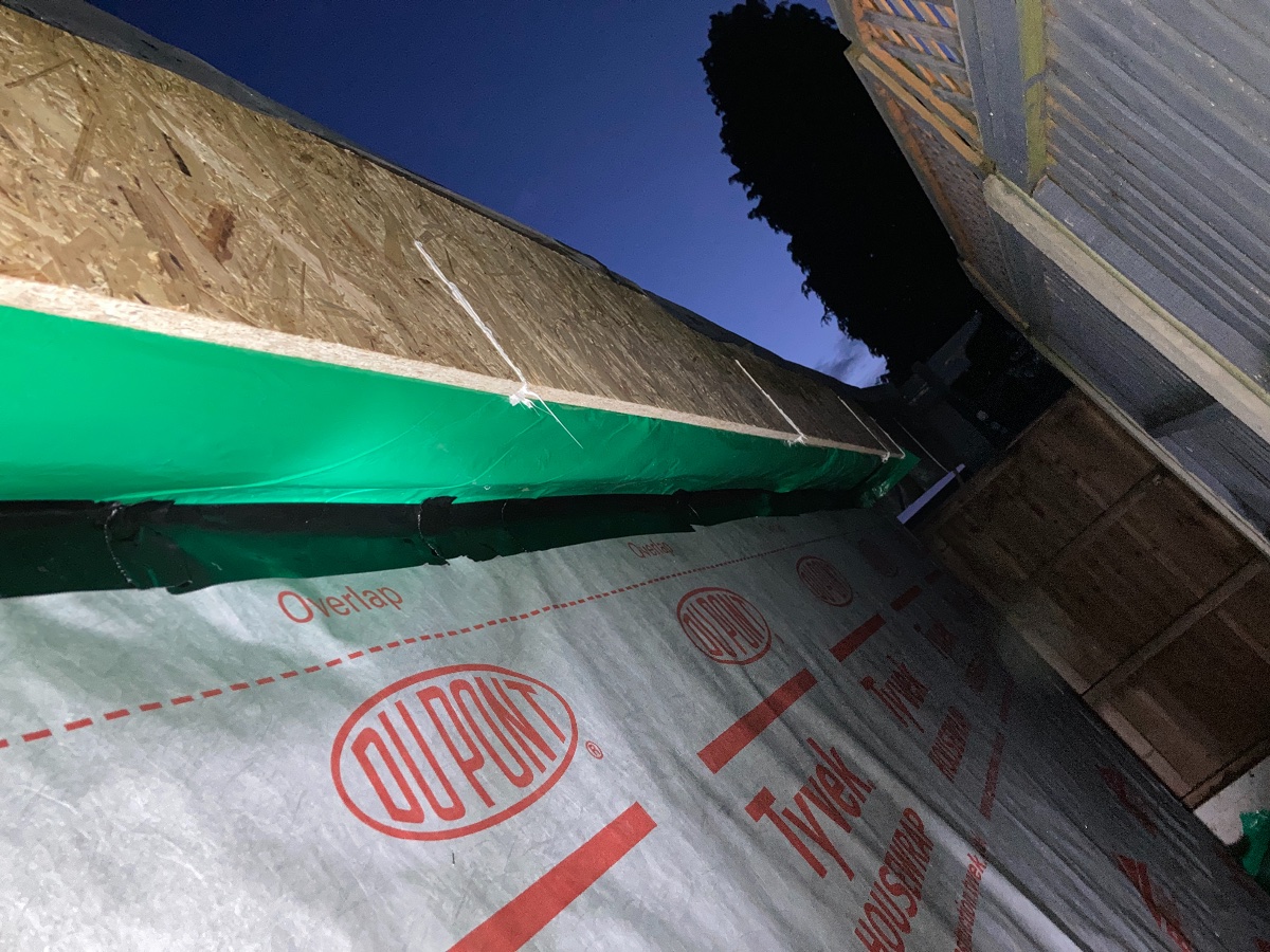I wrapped the building with Tyvek and then overlapped the vapour barrier from the roof deck at the back (as advised by our family friend architect who has helped with the design).