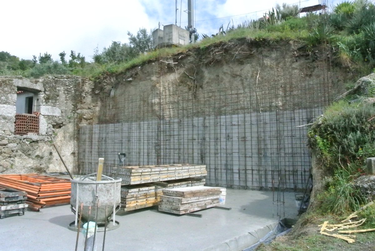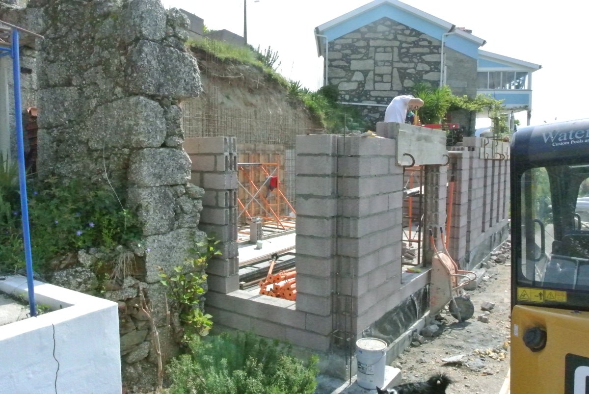 Raining on and off today. Guys did not show up until after lunch. Finished the supports on the back for the retaining wall. 3.5m x 11m…. Still some more steel on the top. They put the first blocks on the building today! They are huge. Special thermal bricks.