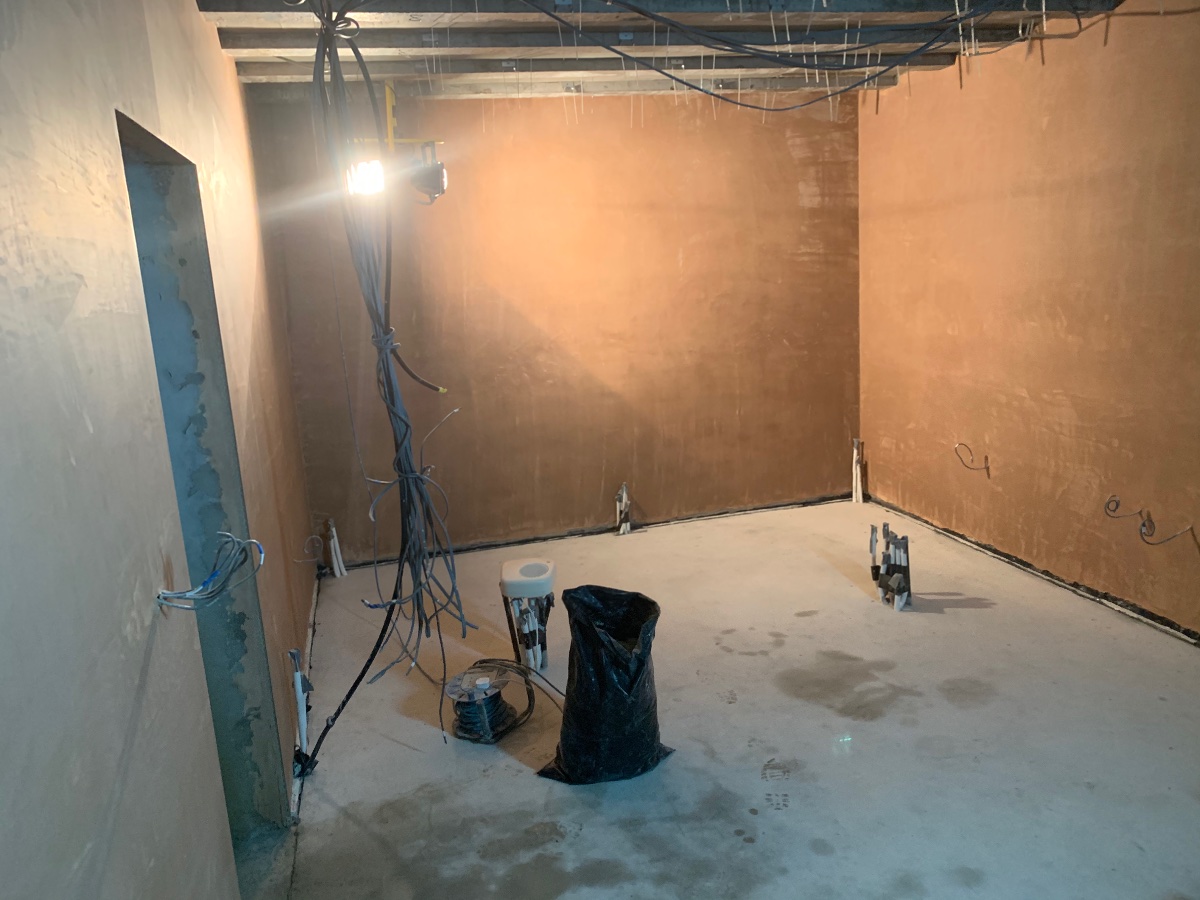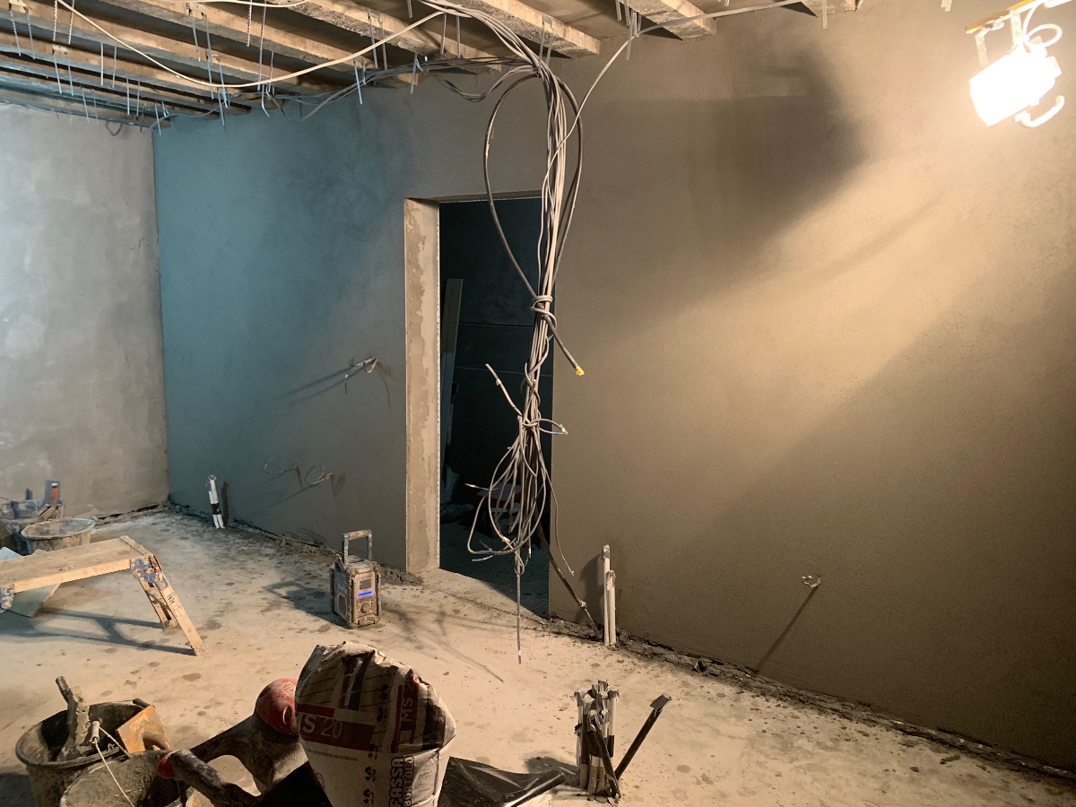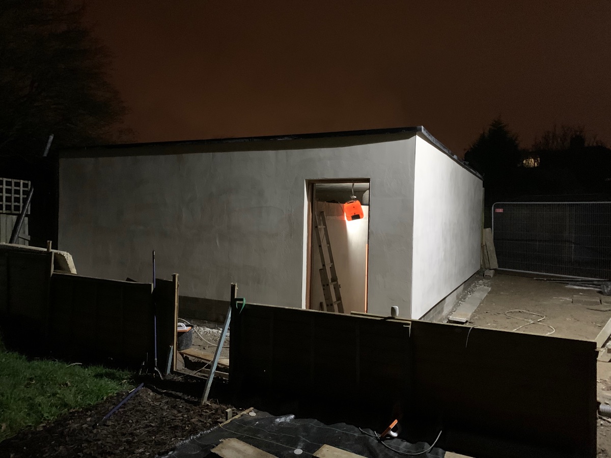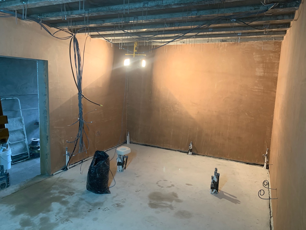 You probably don't want to hear this, but it's going to take a long time for that to dry out properly. Once you get the HVAC in, you can set it to just circulate air through the studio, and maybe dehumidify as well. Even so, it's going to take a while. Don't forget that your underlying concrete is still curing, and will be for months. Concrete reaches maximum strength after a month or two, but carries on curing for years, actually. It's a common misconception that concrete "dries", as the water evaporates, but that's not the case: concrete does not "dry"... rather, it "cures". Its a chemical reaction that takes up the water, slowly, and it takes years to fully complete, if you get down to the microscopic level and take a close look. So don't expect the room to be fully dry for a long time yet (weeks to months: not years!). Especially in your current damp environment outside, with the rain and high humidity: it takes even longer like that.with the moisture inside produced by drying our render and plaster the corridor render was damp...either from condensation dewing on the coldest parts (where the masonry is soaked from the outside) or from the soaked masonry coming right the way through! This may have been compounded by me having to take the plastic roof off as it was starting to pull the scaffolding in on itself...a job I did at night : )