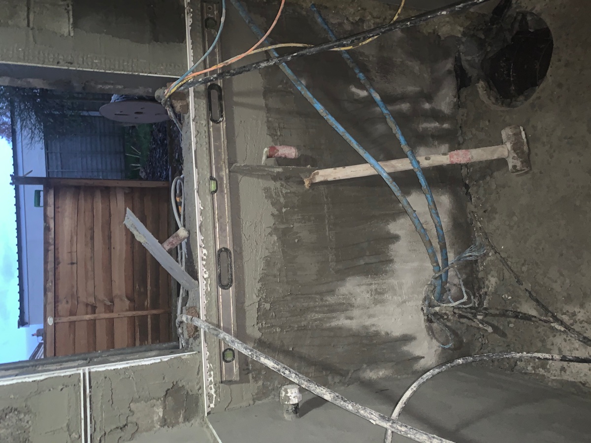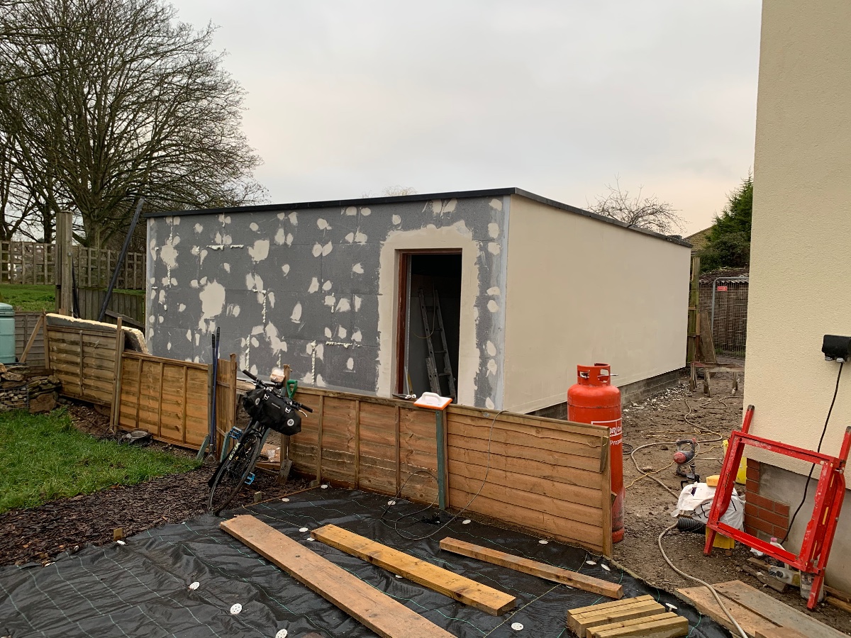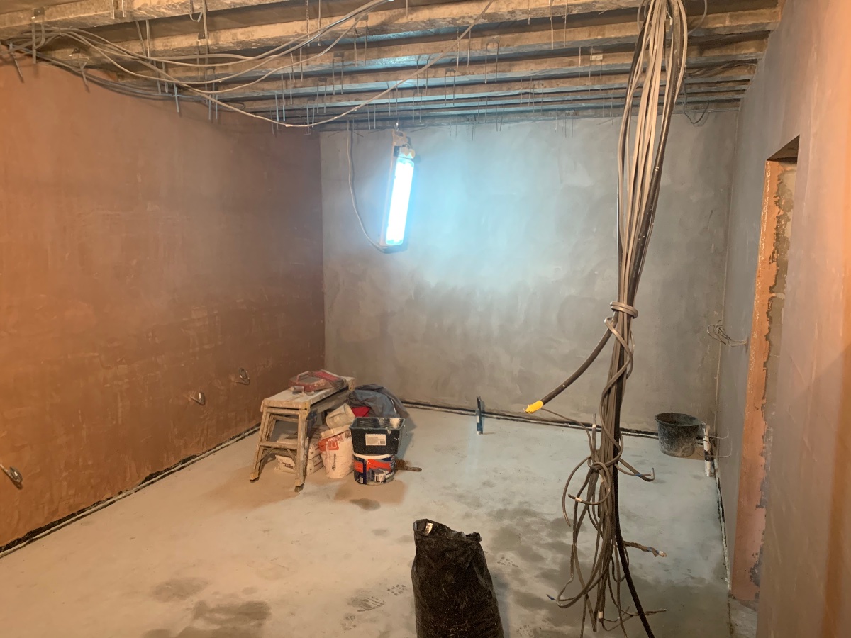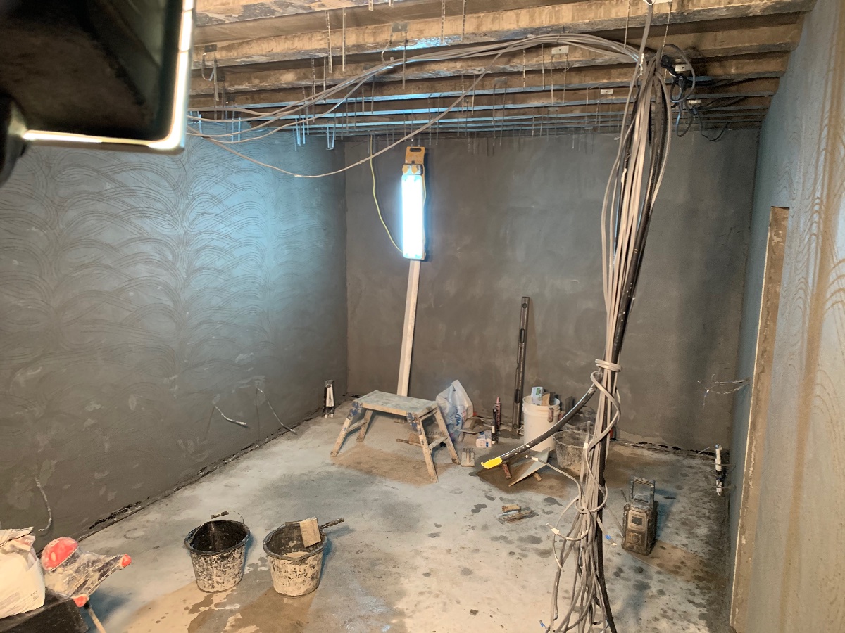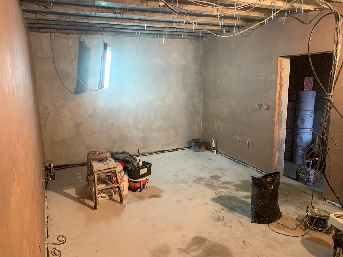 You probably don't want to hear this, but it's going to take a long time for that to dry out properly. Once you get the HVAC in, you can set it to just circulate air through the studio, and maybe dehumidify as well. Even so, it's going to take a while. Don't forget that your underlying concrete is still curing, and will be for months. Concrete reaches maximum strength after a month or two, but carries on curing for years, actually. It's a common misconception that concrete "dries", as the water evaporates, but that's not the case: concrete does not "dry"... rather, it "cures". Its a chemical reaction that takes up the water, slowly, and it takes years to fully complete, if you get down to the microscopic level and take a close look. So don't expect the room to be fully dry for a long time yet (weeks to months: not years!). Especially in your current damp environment outside, with the rain and high humidity: it takes even longer like that.with the moisture inside produced by drying our render and plaster the corridor render was damp...either from condensation dewing on the coldest parts (where the masonry is soaked from the outside) or from the soaked masonry coming right the way through! This may have been compounded by me having to take the plastic roof off as it was starting to pull the scaffolding in on itself...a job I did at night : )