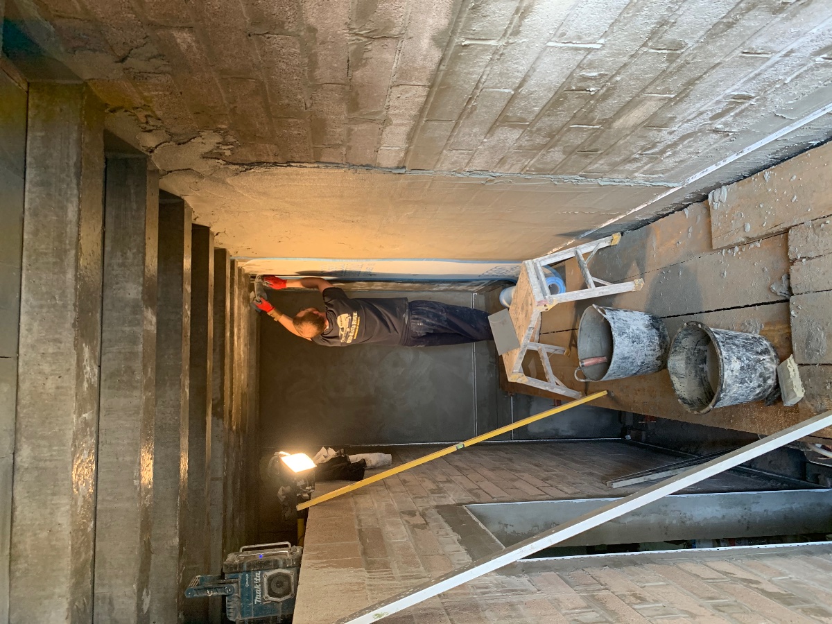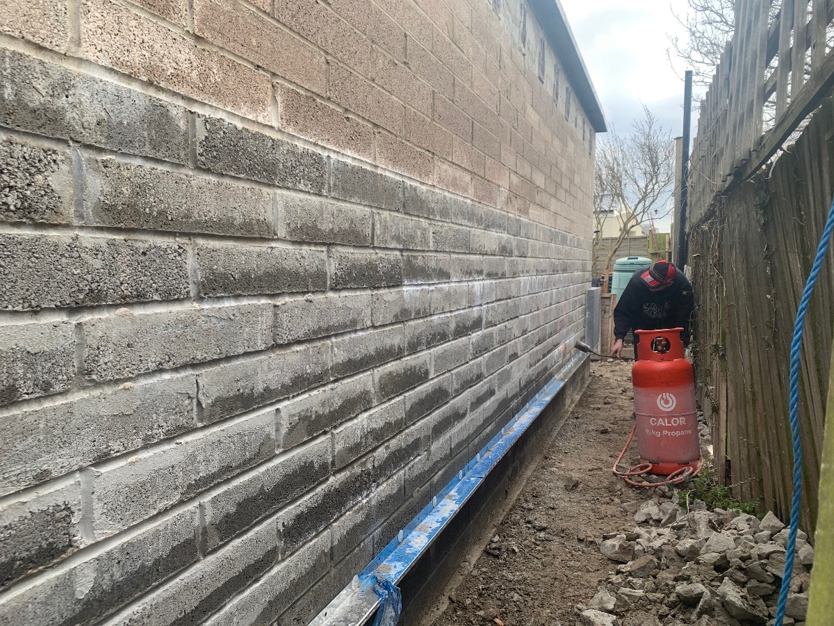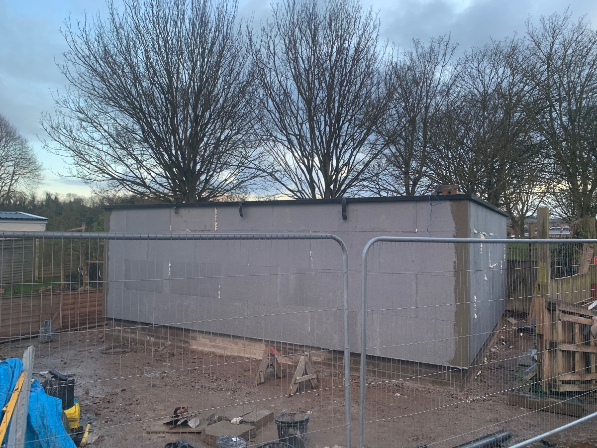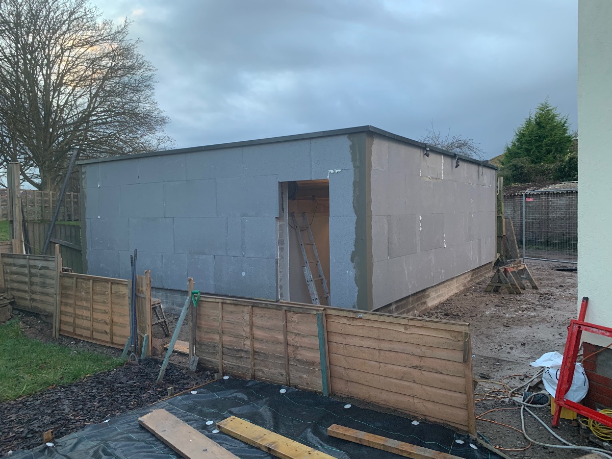 You probably don't want to hear this, but it's going to take a long time for that to dry out properly. Once you get the HVAC in, you can set it to just circulate air through the studio, and maybe dehumidify as well. Even so, it's going to take a while. Don't forget that your underlying concrete is still curing, and will be for months. Concrete reaches maximum strength after a month or two, but carries on curing for years, actually. It's a common misconception that concrete "dries", as the water evaporates, but that's not the case: concrete does not "dry"... rather, it "cures". Its a chemical reaction that takes up the water, slowly, and it takes years to fully complete, if you get down to the microscopic level and take a close look. So don't expect the room to be fully dry for a long time yet (weeks to months: not years!). Especially in your current damp environment outside, with the rain and high humidity: it takes even longer like that.with the moisture inside produced by drying our render and plaster the corridor render was damp...either from condensation dewing on the coldest parts (where the masonry is soaked from the outside) or from the soaked masonry coming right the way through! This may have been compounded by me having to take the plastic roof off as it was starting to pull the scaffolding in on itself...a job I did at night : )