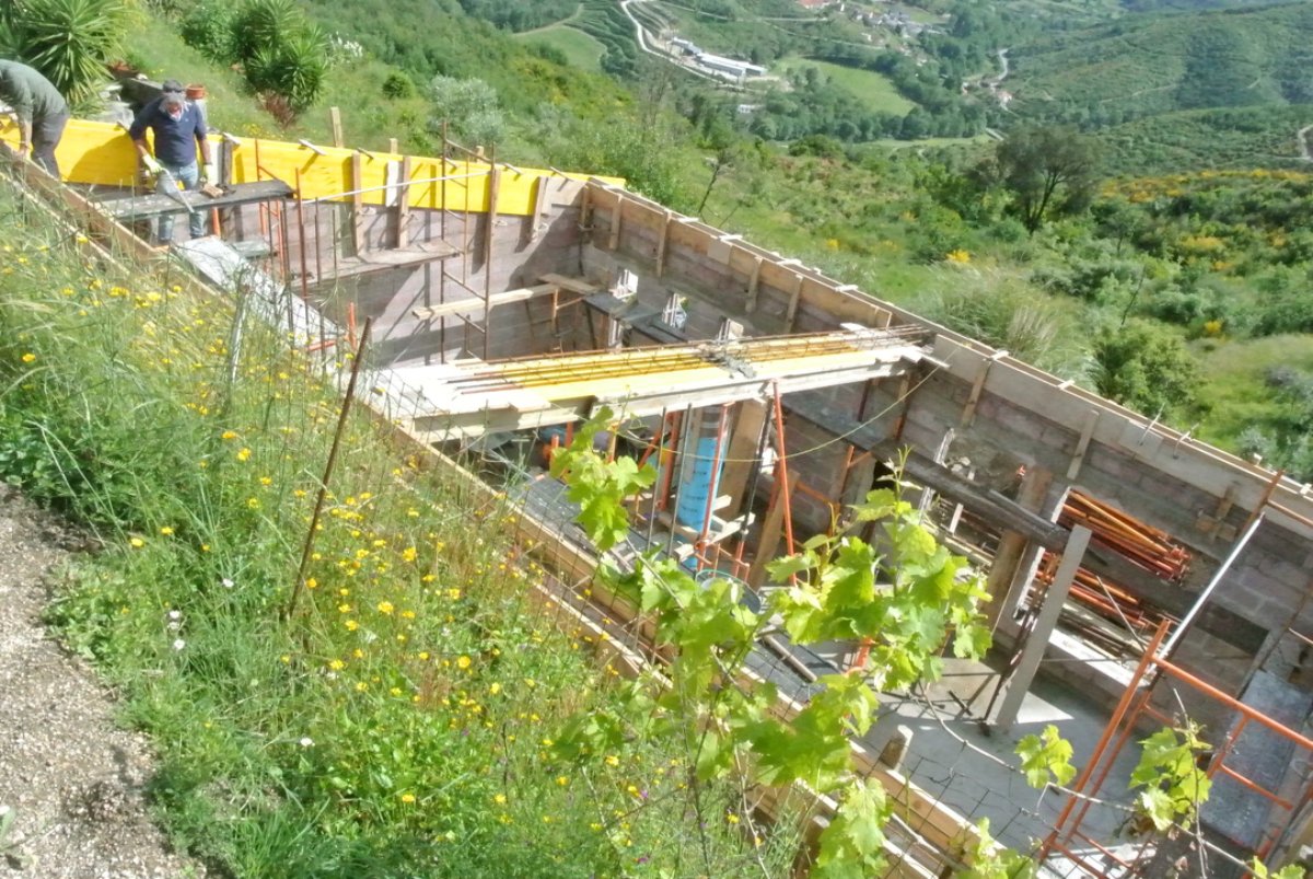 The guys worked to rebuild the ruin wall on the side of the building closest to the house. It will go in several steps down. In the gaps about the stones they will make the caputo system of insulation and water protection