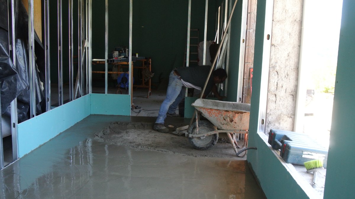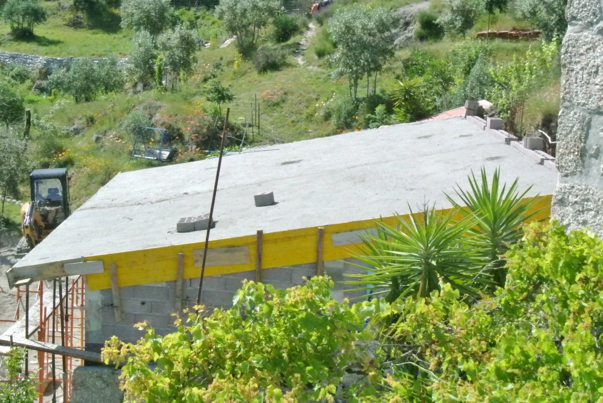 Paul moved the huge pile of dirt with his digger and it looks quite good. They did the last bit of cement on the ruin wall closest to the house and started to tie the building into the other ruin wall. It is going to look great. Gil and José started to put up the supports inside the building for pouring the cement for the front roof beams.