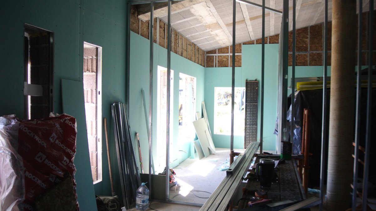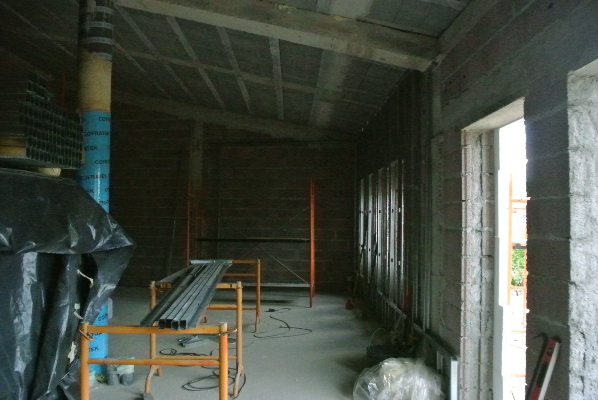 Interior walls are going up now. All the rock wool is in on the perimeter and the first layer of plasterboard as well. They poured the final floor for the entrance yesterday as well. Slow progress but getting there... See the new pictures...