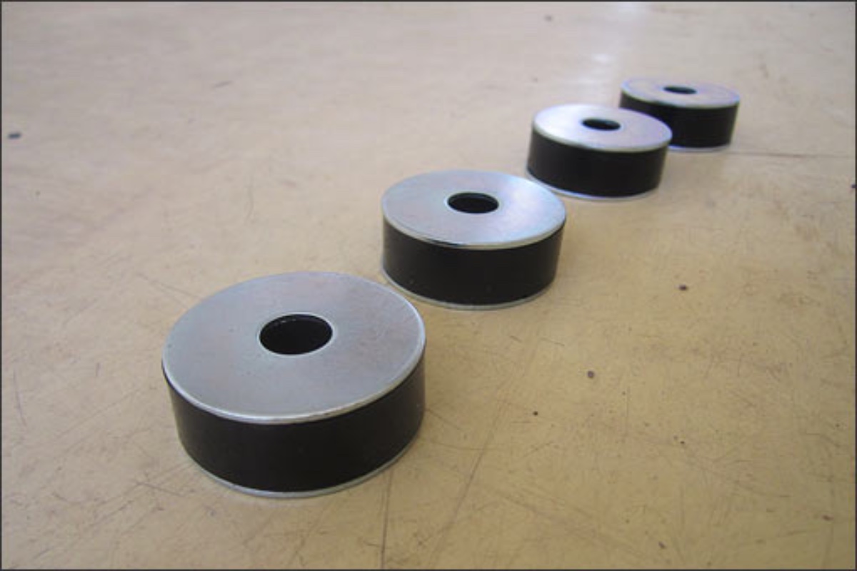 That is incredibly useful, thank you. I've been trying to figure out how to float silencer boxes on floor joists (as opposed to ceiling) and that has inspired the answer. The problem was how to stop the silencers sliding or vibrating off sorbothane dome shaped pads. The sorbothane rings are just the thing though, I could put circular locater "keys" or protrusions in the joists and silencer outriggers that fit into the centre hole of the ring. As long as the keys don't come into contact with each other under compression all should be well.