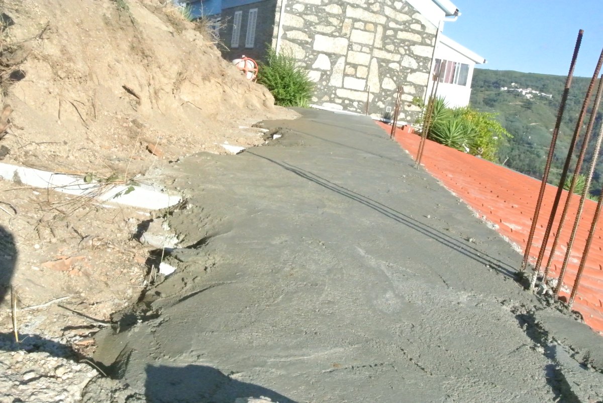 Gil and José showed up about 10 til 9 and seem set on pouring the entrance way floor straight away. Gil is making the cement (it is hot today, going to be 28C in the shade) and José is spreading it out to make the smooth floor. Still having the crane is making this job much easier. It is still probably 20 loads of cement as you only get 2 full wheelbarrows per batch that can be brought down with the crane. It is pretty smooth but there are still some semi-circular lines that stick up. I hope you won’t feel these through the linoleum floor. Not sure yet what the floor will be in the entrance way yet. I guess they will leave today when they are finished with this as they can’t get in the building to do much after this unless they crawl through one of the smaller window slots but these are partially covered up with the outside insulation. We will see…