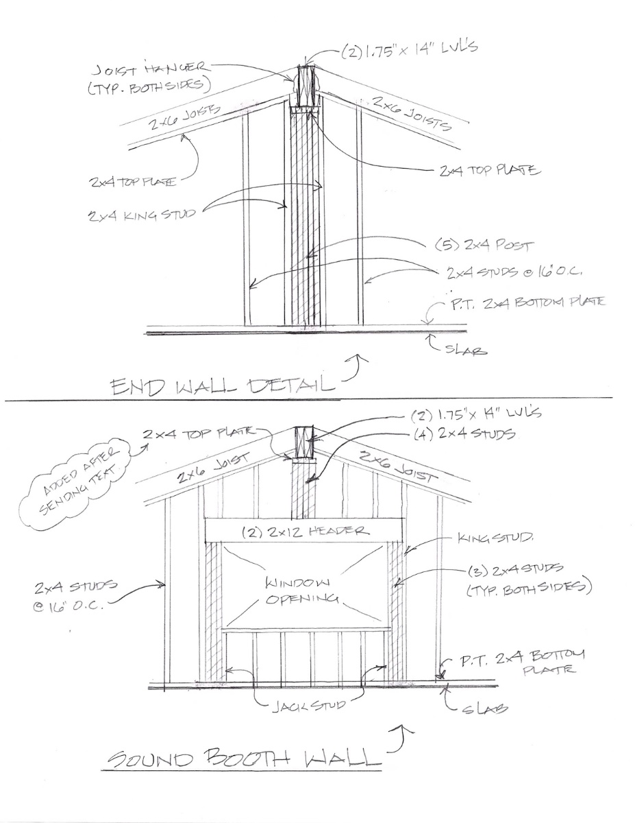 Careful with that! You seem to be showing your inner-leaf walls directly connected to the outer-leaf! Are those joists at the top your outer-leaf? Or are they the inner-leaf ceiling? If that's the outer-leaf up there, then you have a problem.... The inner-leaf of each room is entirely independent from the outer leaf: no mechanical connections at all. Not even one single nail. Each room in your studio is a single-leaf stand-alone structure, with it's own walls and ceiling. All of the rooms sit within the outer shell of the building, which is your outer leaf. The only exception are the two end walls, that will seal off the studio section from the rest. At the entrance end, you'll have your lobby, bathroom, storage and maybe kitchenette, OUTSIDE of the studio area, then comes the isolation wall, which is really part of the outer leaf. At the other end you'll have the wall that closes of the studio towards the future control room, which will also be an isolation wall, and an extension of the outer leaf. In between those two end walls, is the actual studio space. In there, you will build one structure, which is the live room itself, and a second structure, which is the isolation booth. Each of those is stand-alone structure: framing for the walls and ceiling, with sheathing (OSB, drywall, etc) on only one side of the framing. The Live Room is one structure that stands up all by itself, without touching the outer leaf or the booth, and the booth is a separate structure that stands up all by itself, without touching the outer leaf or the live room.I do plan on finishing the wall between the LR & CR as you said. I've added a makeshift drawing of that.
