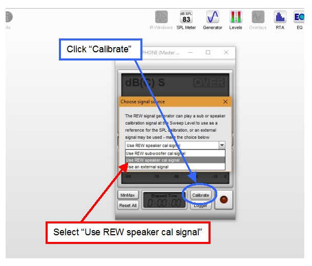Click on "Calibrate". A window opens asking you to select the signal source: Set it to "Use REW speaker cal signal", and click "accept". Like this: