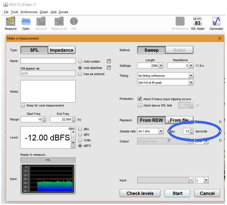 Makes sure that "Start Freq" is set to 10, "End Freq" is set to 22,000, "Level" is set to -12dB, "Length" is set to 256k, and "Repetitions" is set to 2