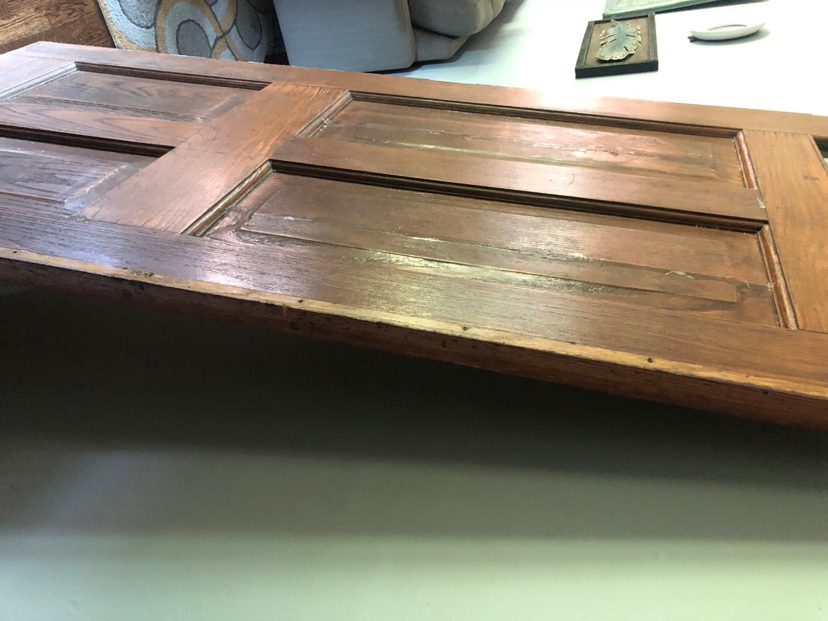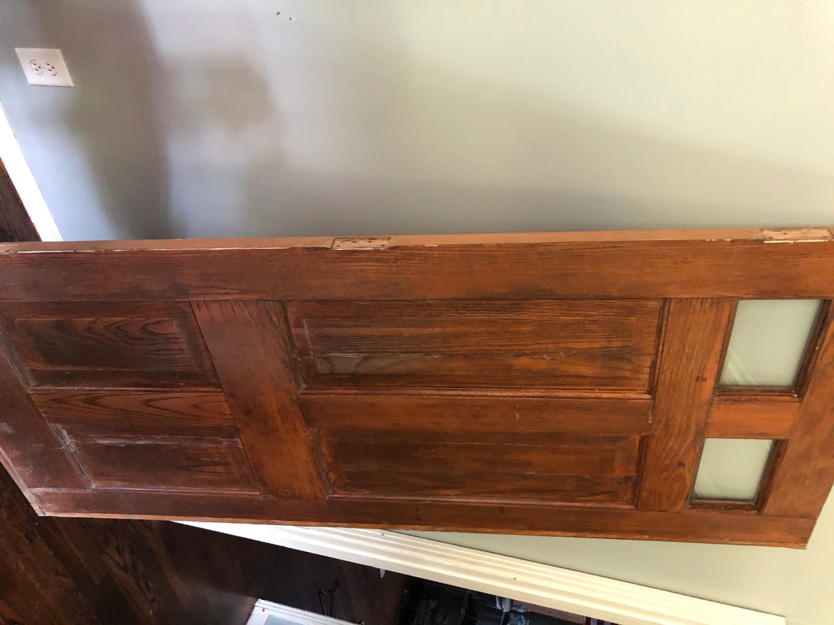 I did however make a move on the door though! (photos below) I did some research last night and was finding very little in the price range I was hoping for. However, one person about 30 minutes out was selling a 1 3/4" thick solid wood door at the dimensions I needed for $75 and I ended up getting it for $50. It's VERY heavy and with a good sanding/staining, it will match the antique/vintage vibe of the house perfectly. It does have 2 very small glass windows near the top but I'm happy to cover/seal these if needed to keep the density matching the rest of the door. I'll see if I can apply some of Rod's advice when hanging this thing.
