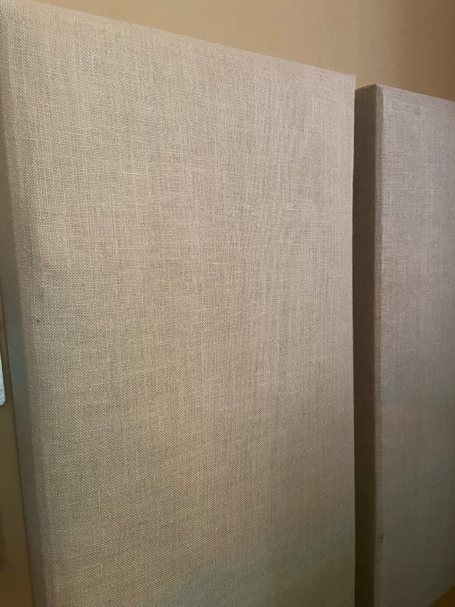 I then went to look up the burlap fabric that ATS acoustic sells because the panels I have by them look great (second and third photo below)! But, they are pricey so I ordered some small samples of an equal grade weave (10-11oz) from https://burlapfabric.com/colored-burlap/60-inch-colored-burlap?zenid=j69hg9r2imcodjl98tc8bp4035 which ended up being better than Joanns but I'm not confident it won't have the same "see-through" issue.