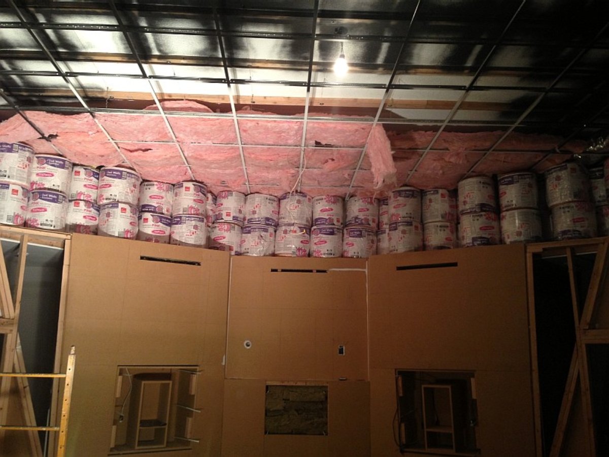 Yes, that really is an insane amount of insulation up there! :shock: Those really are full rolls of pink fluffy insulation up there... many! We lost count, in the end. But it was a simple and relatively inexpensive way to do it, because the studio owner is also involved in the construction business, and could get good prices for that. And as you can see from the results: it works! :)