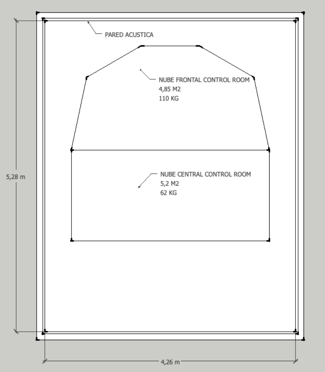 Control room: 5.28 meters length, by 4.26 meters width, and the ceiling weights about 770 kg. (34 kg/m2)