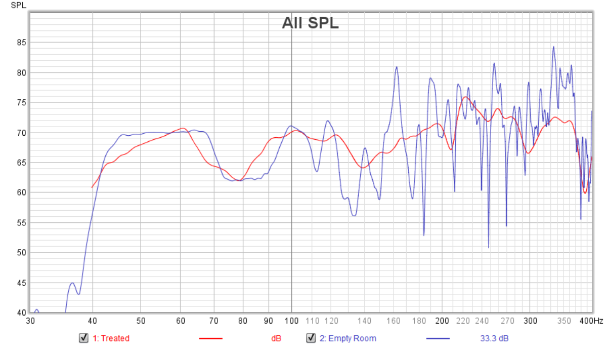 Proof of the pudding: Here's an REW graph comparing my main room empty and the treatment it had nearly five years ago. The bass traps are 4x2' with 4" deep Rockwool RW5 insulation. Arguably too dense at 100 kg/m3, although the jury is out on this at 4" depth. In retrospect RW3 would have been a better choice. There were some 2" deep commercial panels on side walls and ceiling too.