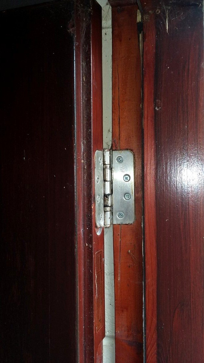 I've not attached the second inner core to the main outer door yet. Reason being that with the extra weight, it would be much harder to balance in position, and to get it level and straight to then mark/install the hinges. Now I have the hinges installed, I will be removing the door, staining it (along with the frame), and attaching the second core to the inside of it (also stained)... this way, I wont have to be checking and tweaking and moving with all the extra weight - should just go up into place! I don't envisage any sagging from the extra weight, purely because the jamb is this massively chunky and hard wood (you'll see from the photos below) - heavy as hell!
