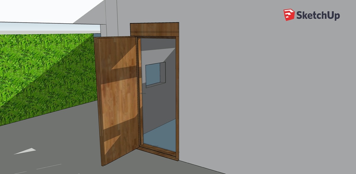 Unlike a lot of the designs and examples I've seen online, where the opening for the door is planned at a specific size, I am dealing with an already-existing opening, with its own dimensions (again a SketchUp of this is below). This means that, given the width of the door is also set in stone by the supplier to a maximum of 910mm, I am unsure of how to fill in the gaps either side, and above, the door.
