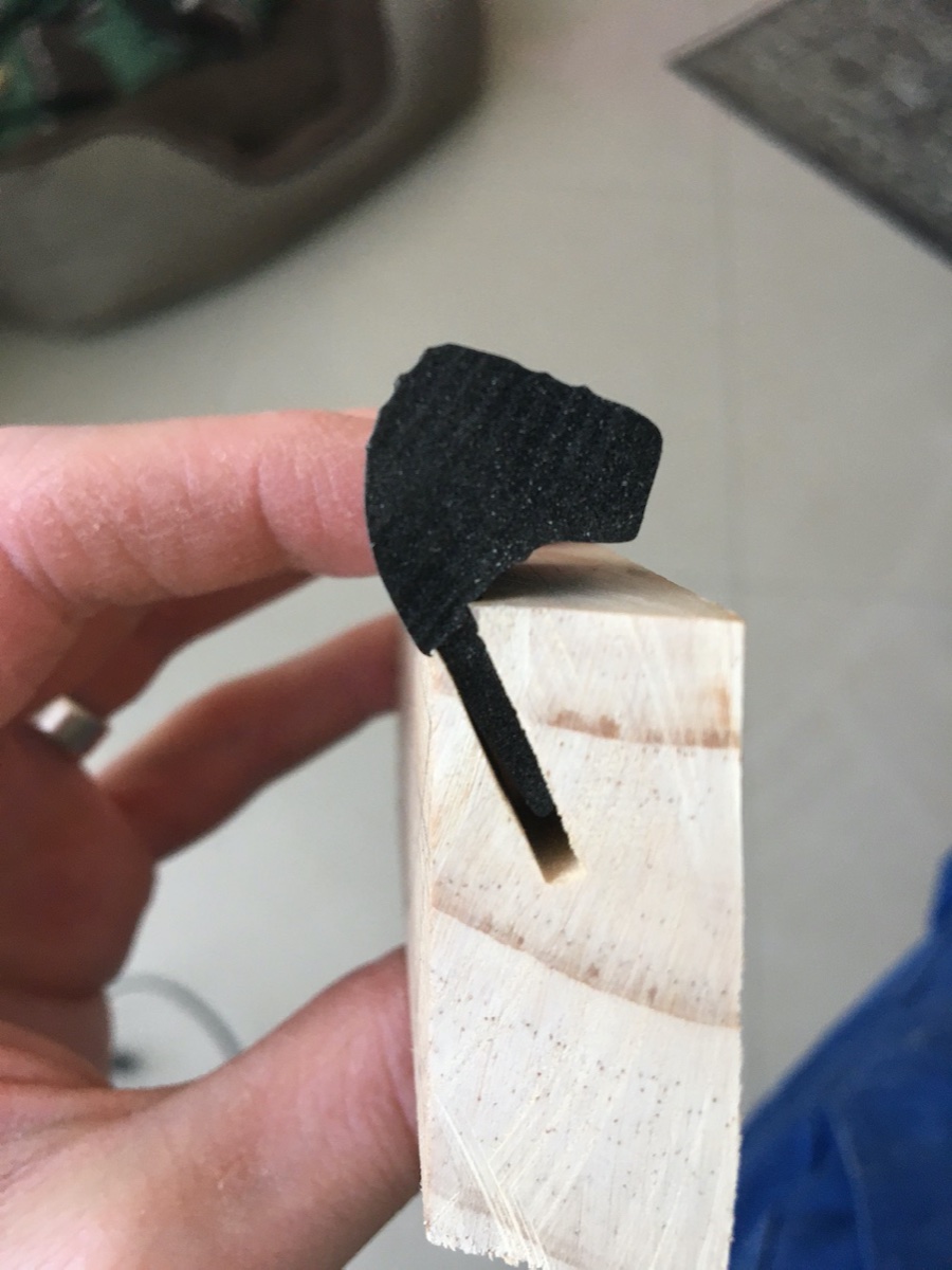 Now, I fashioned a pretend jamb/stop, and wedged the seal inside, attaching it with a few nails to the jamb first, then wedging it between the stop and jamb, and here is how it has come out: