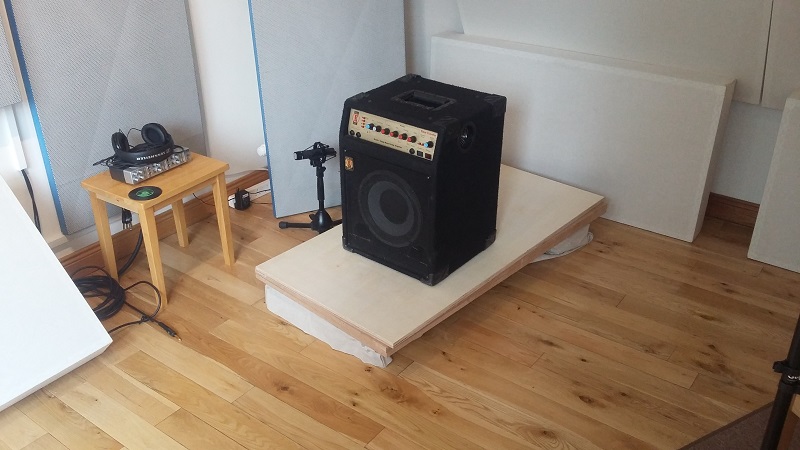 The riser has been stunningly effective in reducing the vibration & rumble from a floor fan to the room below - putting the fan on a chair predictably achieved nothing - so I thought it would be interesting to see how it performed on a bass amp. For the actual test I had the amp & riser in the middle of the room. Decibel meter in the room below at seated ear height, 120cm from floor.