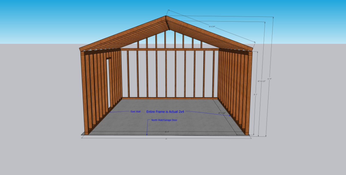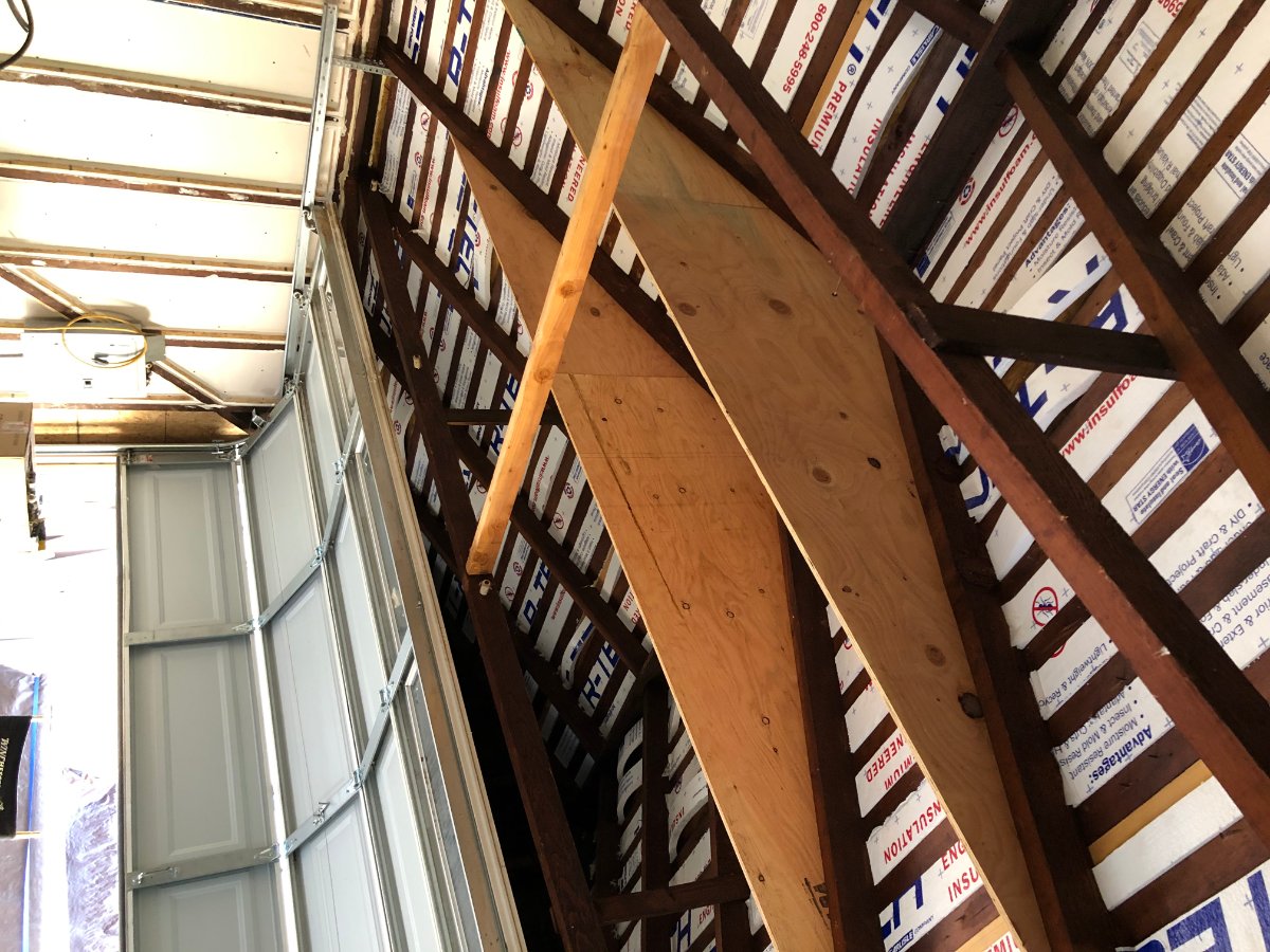At this point, all 3 walls, including the gable end above the garage door and the ceiling are "beefed up". I am sealing up the garage door as we speak. next up is building the interior frame.