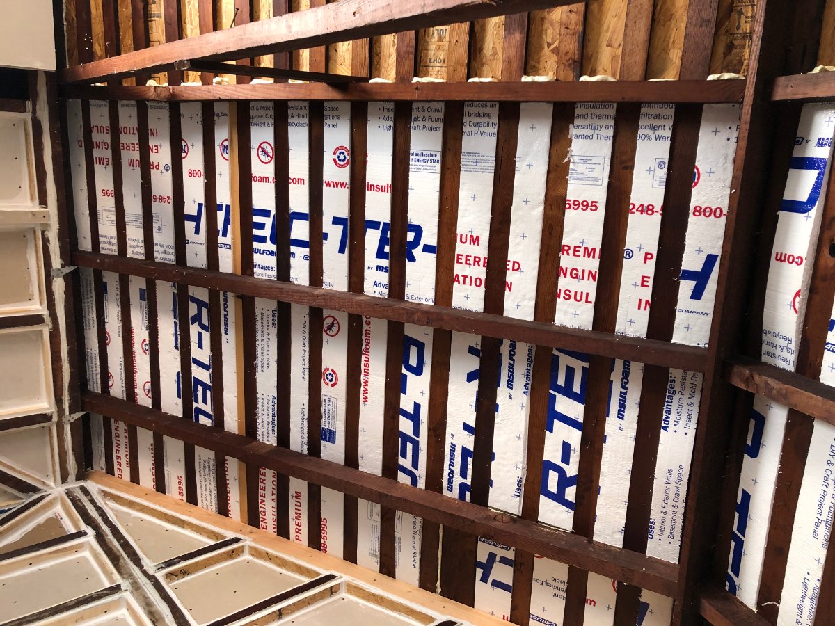 So I added 1" EPS foam in between each slat. Again, INSANELY tedious because no two gaps were the same size, but it allowed me to add a layer of mass directly to the underside of the roof sheathing with no gaps, making sure the outer leaf was one continuous leaf.