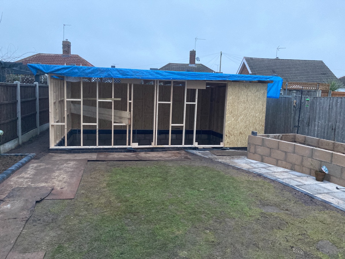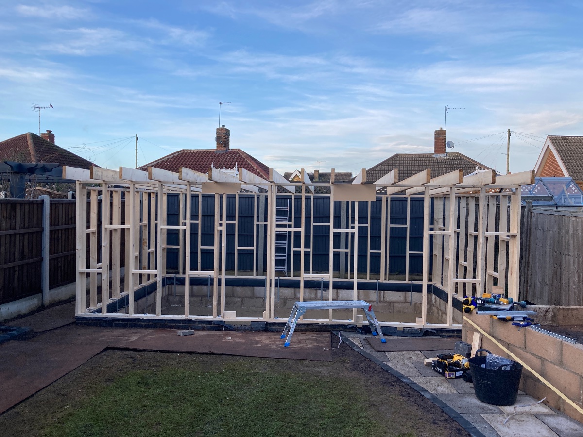 Today my brother in law and I fixed the frames to the dwarf walls, got the joists up and the first layer of OSB on to the roof. It was almost dark when we were putting a tarpaulin over the OSB so I couldn’t get an end of day picture but I’m really pleased with getting this much done in one day.