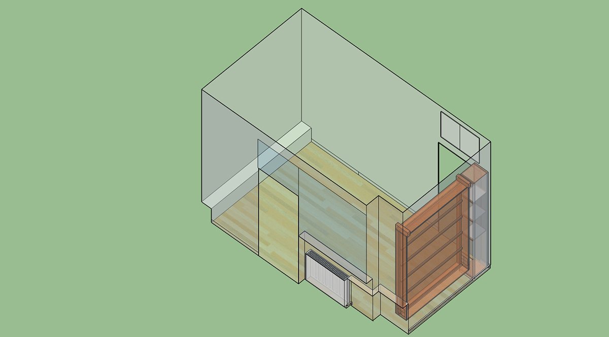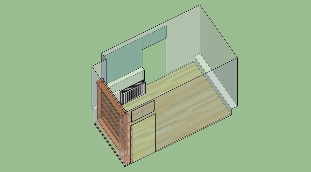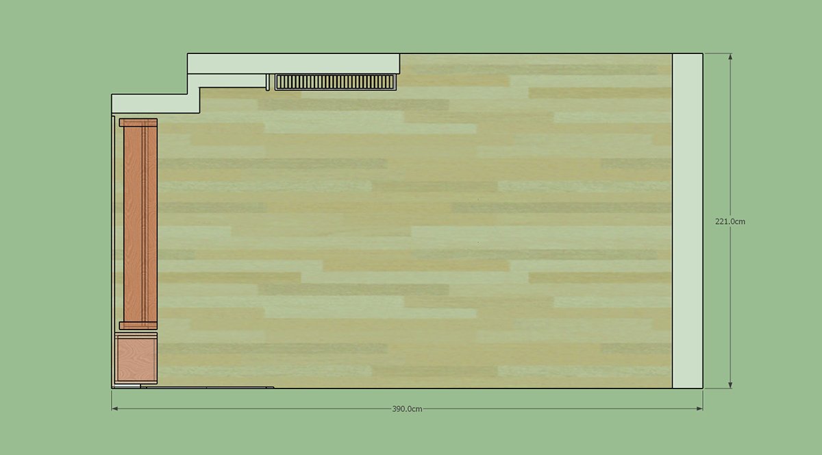 The room is 390 x 221 x 290. Here are some pics from the Sketchup model I made: