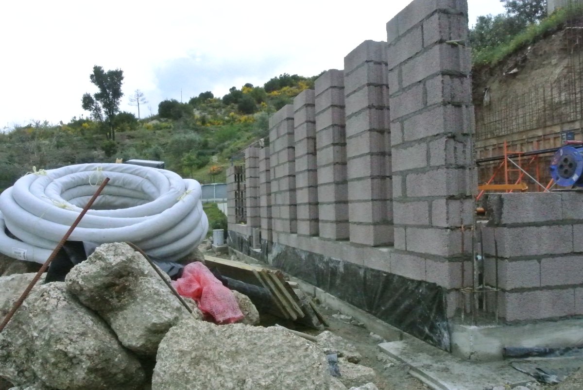 Raining on and off today. Guys did not show up until after lunch. Finished the supports on the back for the retaining wall. 3.5m x 11m…. Still some more steel on the top. They put the first blocks on the building today! They are huge. Special thermal bricks.