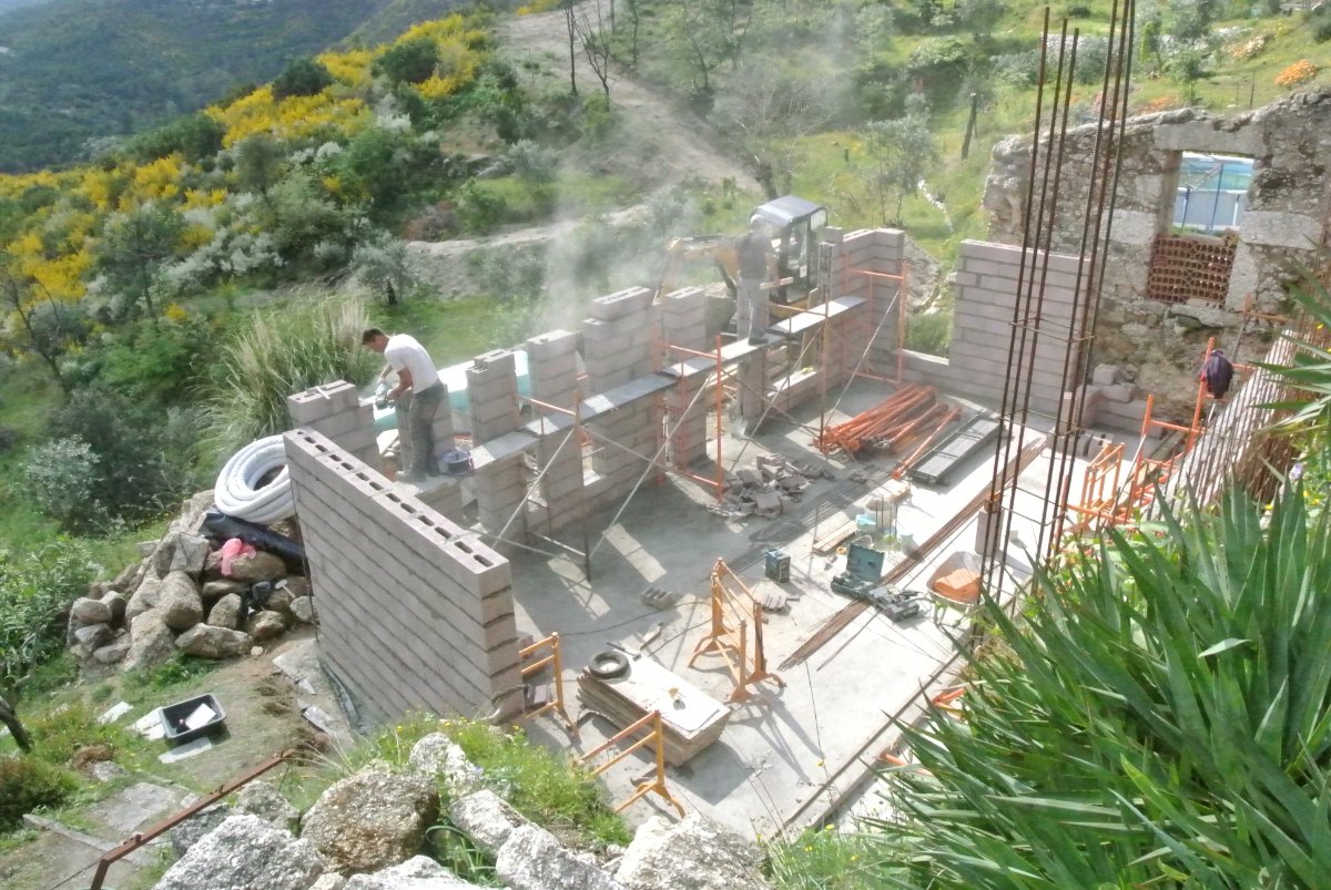 Started off sunny but was cloudy but 15. The guys made good progress on the steel shuttering now that the steel was finished. The first 3m is almost done. Paul said they will try to shutter the entire thing instead of doing 2 pours. He said there is a lot of security work as you can’t have it leak or collapse as it would be a total disaster. He thinks they will pour it next week but if they have to wait for the concrete it is not a problem as all the bricks arrived today for the walls. 12 pallets!! 25cm wide and about 40 or 50 long. Did not measure it. Seems like way too many blocks. We will see. Still need the ones for the roof and the concrete beams for the roof as well. He says they are on schedule for finishing by May 12th, when they will come take the crane away. Got another bill from him to pay today. About 6000€ left to pay. Some rain the next 3 days so it will be slower work perhaps.