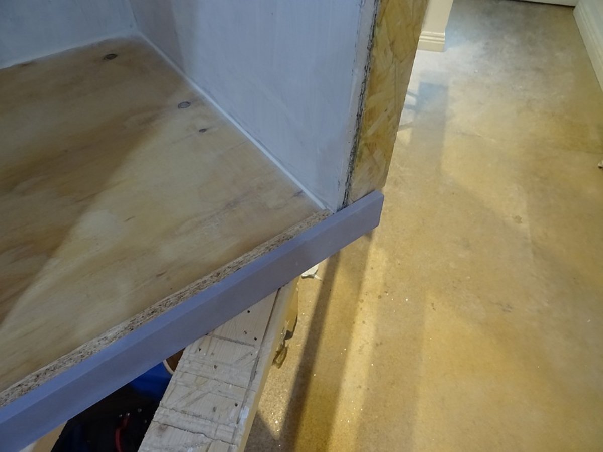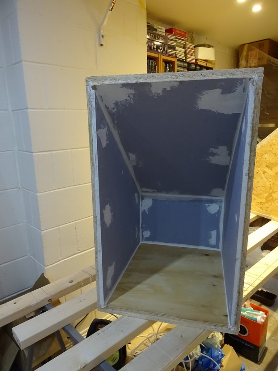 There has to be either an angle on the plasterboard, or an angle on the strip of OSB that will go across the top. The OSB will surround the edge of the bass trap completely - there will also be a strip along the bottom;