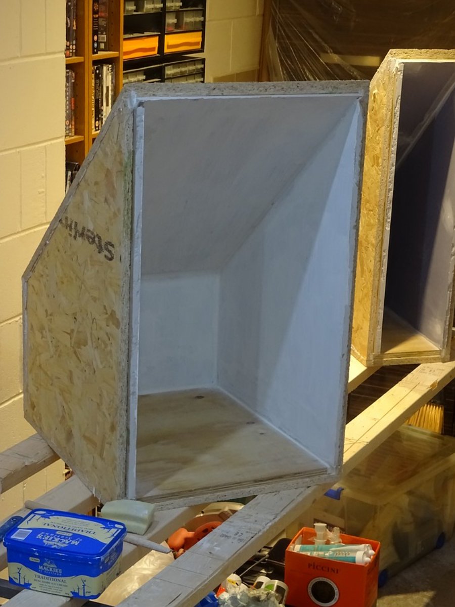 These two are almost ready for a test fit. The inner layer protrudes "bank vault door" style to allow the proper stepped method of joining and sealing. An undercoat of paint has been applied to one of them. It's going to need a couple. In some ways a waste of time as they'll not be visible once the insulation is in place, but if the studio ever stops being a studio they might become cupboards, so might as well do it correctly while access is easy.