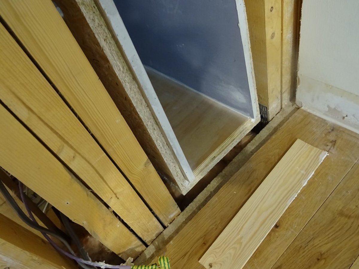 The trap / floor intersection is a bit trickier than the walls. There are mains cables running along on a plank across the joists under the traps. The plank doesn't go all the way across, so I will add one and clip the cables in place so it does;