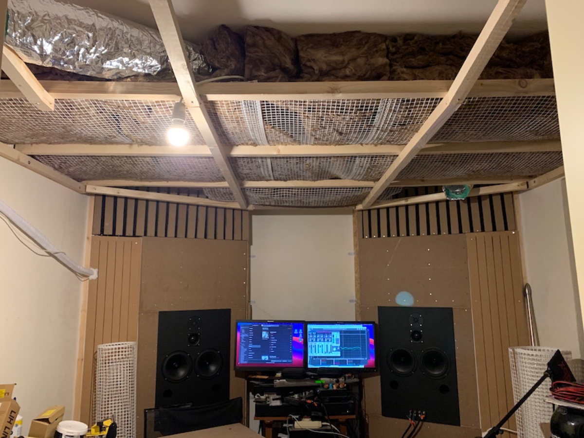 Finding it easier (and perhaps more efficient) to just make a full absorptive ceiling (27cm insulation 5000 Pa.s/m2) than drilling and hanging clouds in a 2,5m high room, I got to work: