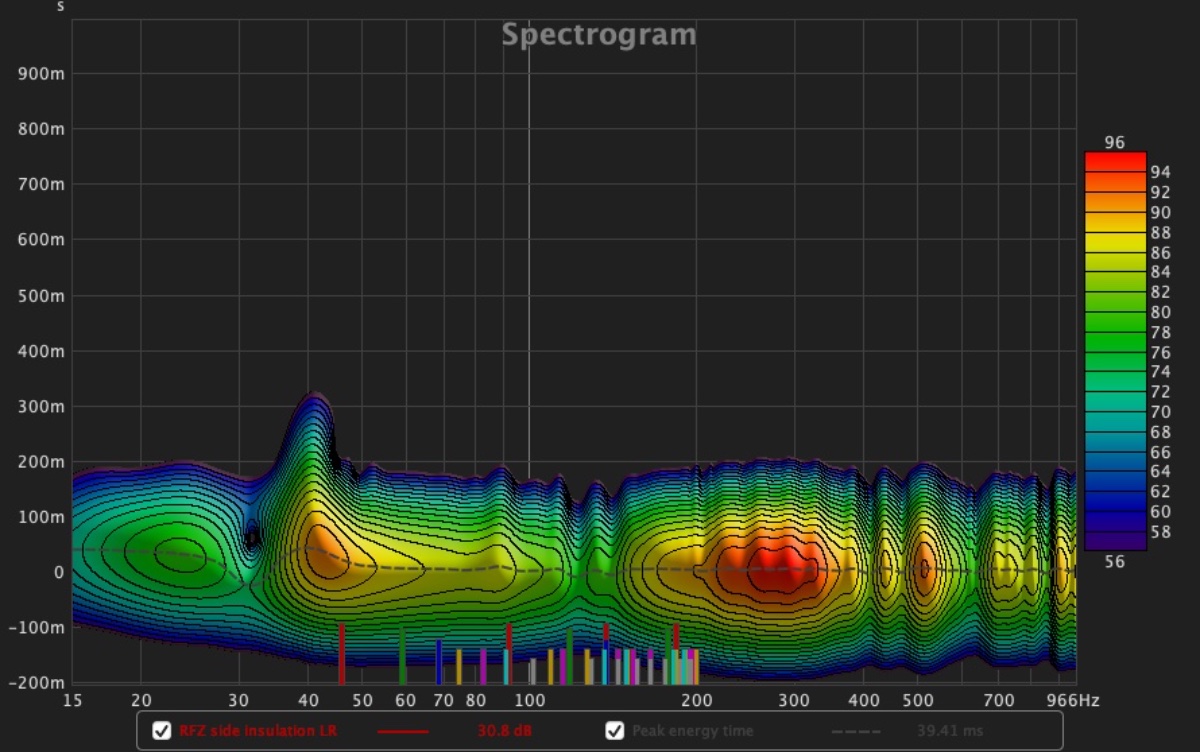The RT is now very short, with is natural with all this insulation, what is not natural and needs investigation is the strange behaviour of the low frequency decay with its ups and downs in every measurement. Anyway generally things improve and as we can see from the before-after rfz panels comparison the listening position is almost free of first strong reflections.