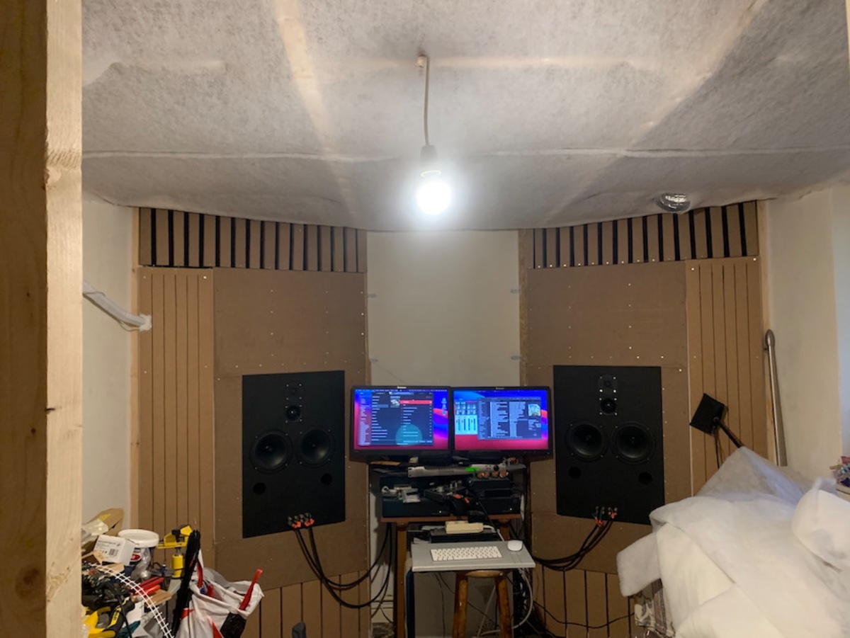 Finding it easier (and perhaps more efficient) to just make a full absorptive ceiling (27cm insulation 5000 Pa.s/m2) than drilling and hanging clouds in a 2,5m high room, I got to work:
