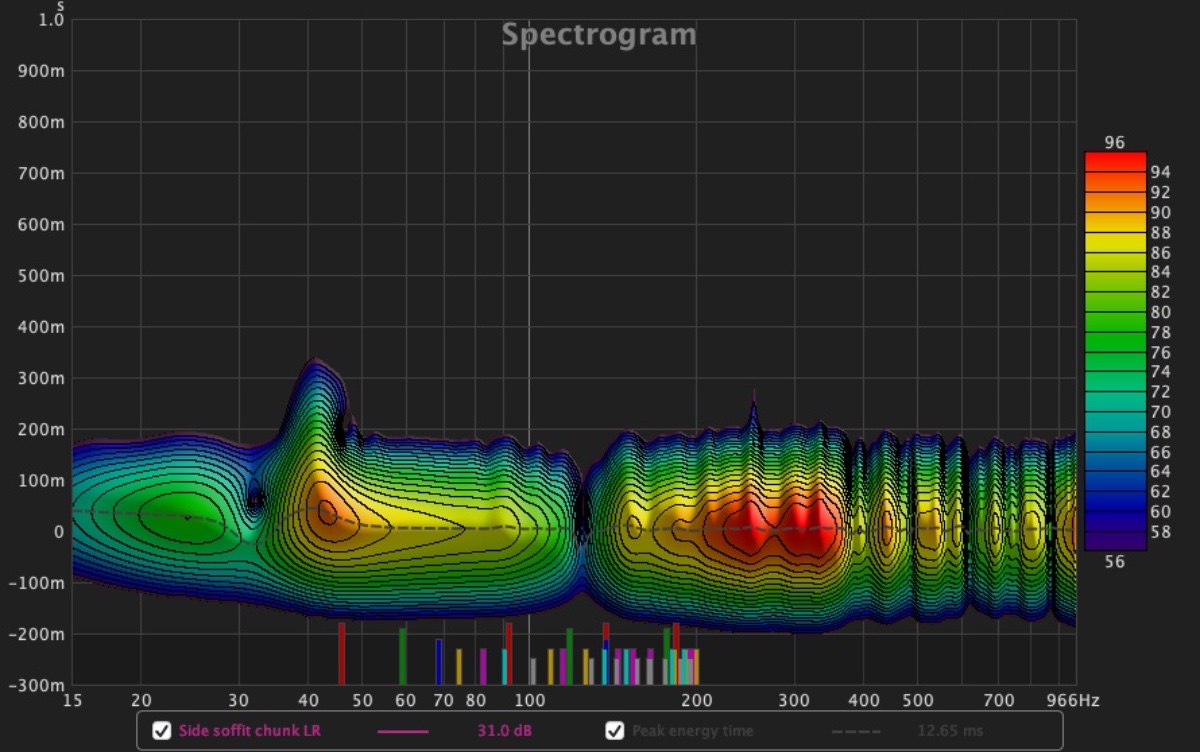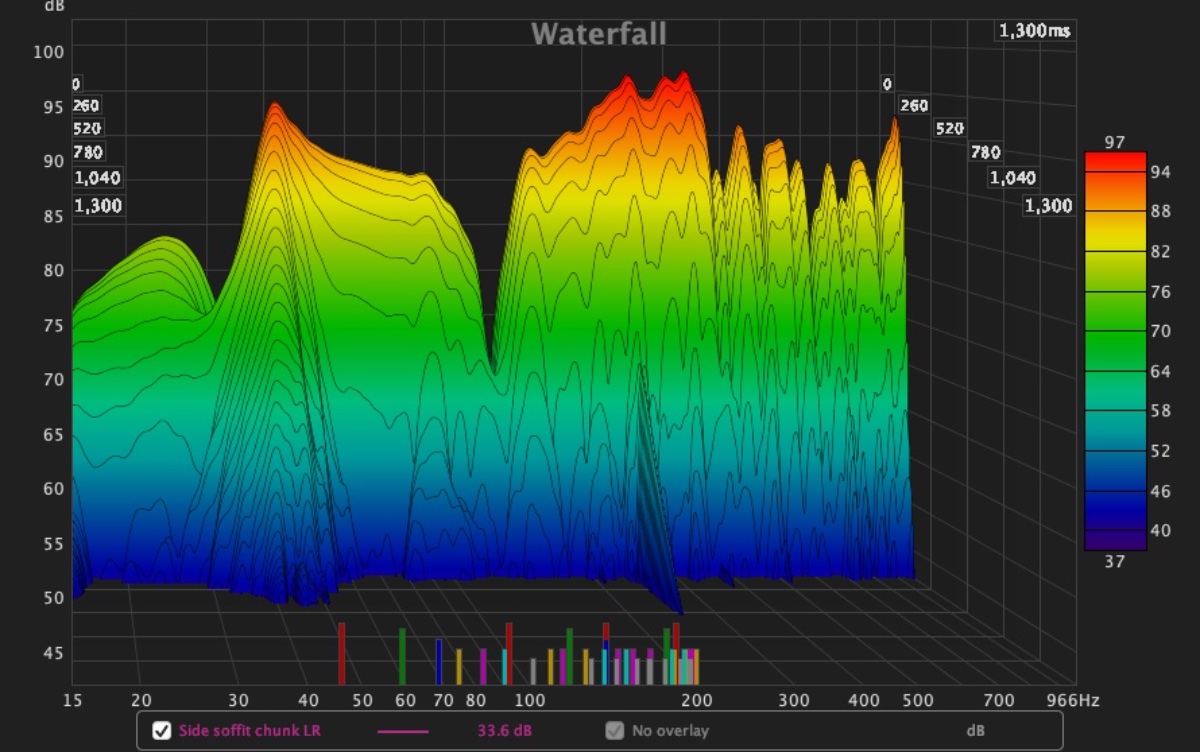 What we are seeing is a further smoothing of the 150-400hz area in the time domain and at last some damping if our old friend the first 42hz mode being visible in all the time related plots. That was nice! The radiator (250hz ringing) is still there, but not for long..