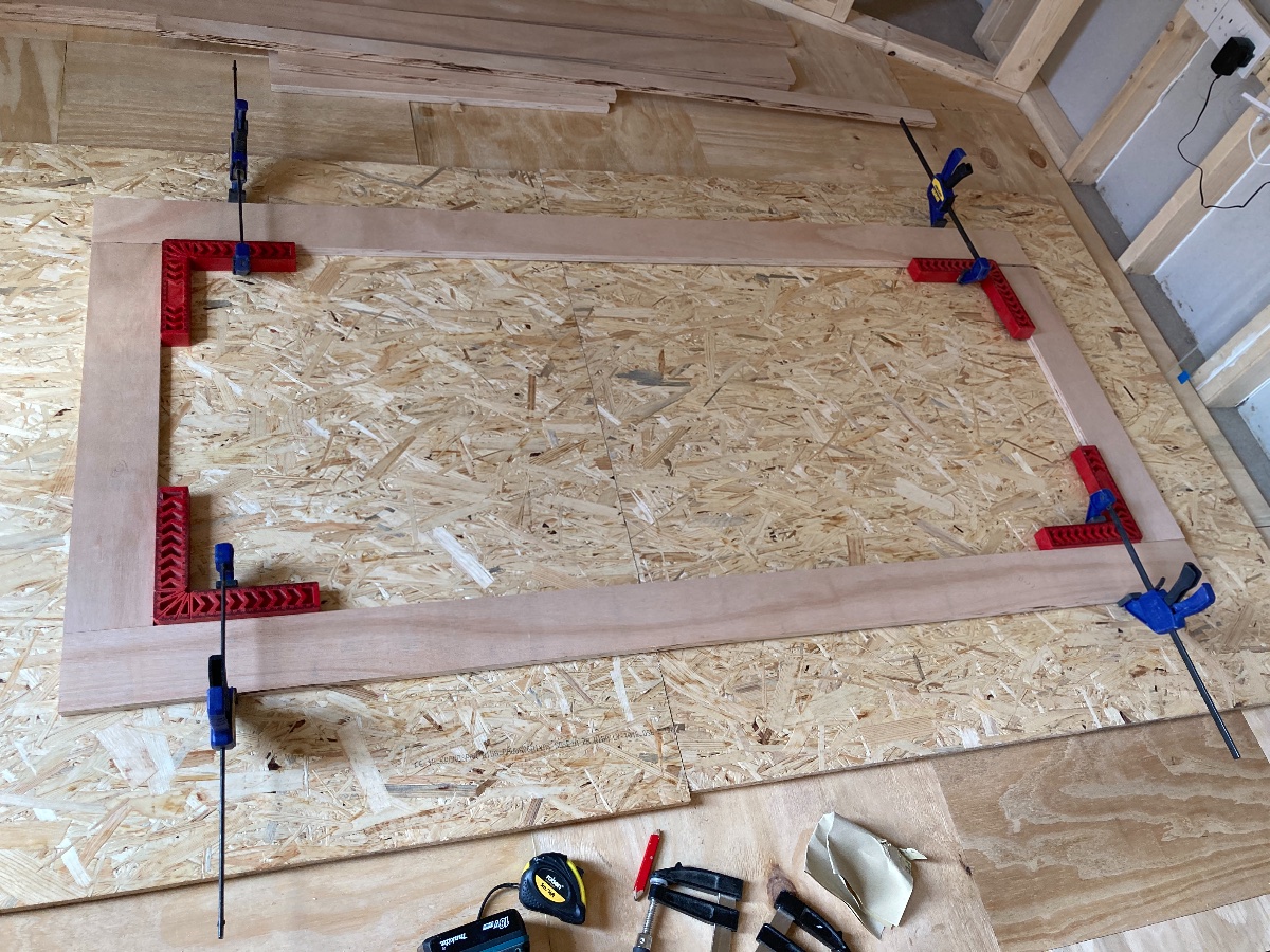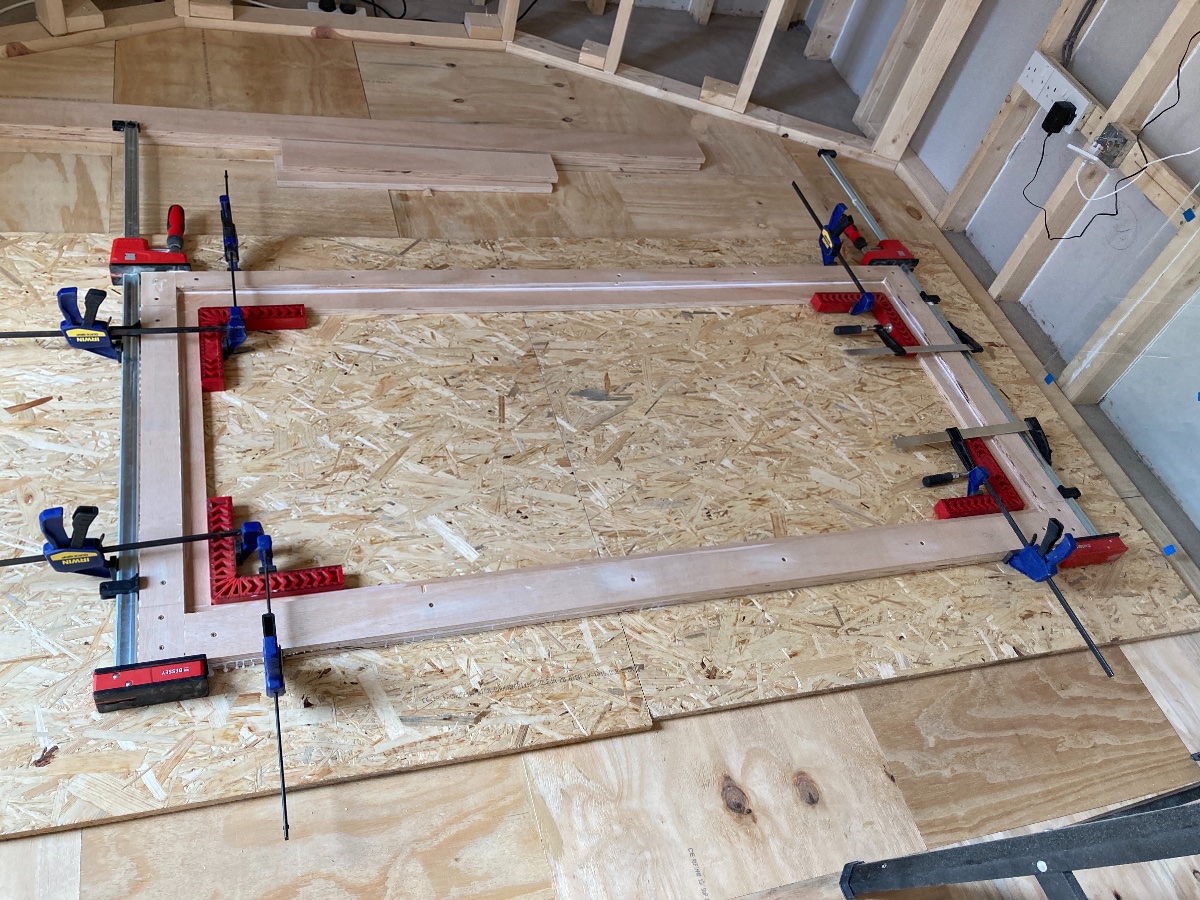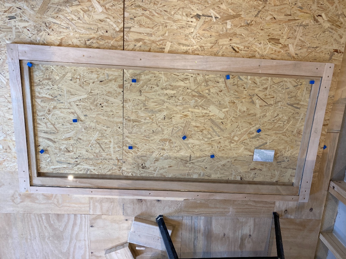 Tomorrow once this is dry I’ll test fit that the glass sits in the middle (middle layer was cut to allow 3mm around the glass for sealant) and then get the door trimmed to fit the frame and the hinges attached, before fitting the glass and sealing. The following day once sealant dry I’ll glue and screw on the third layer, completing the sandwich.