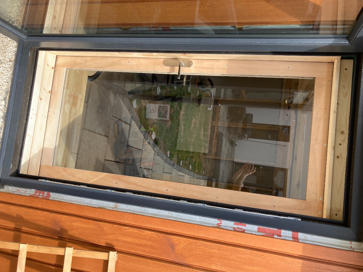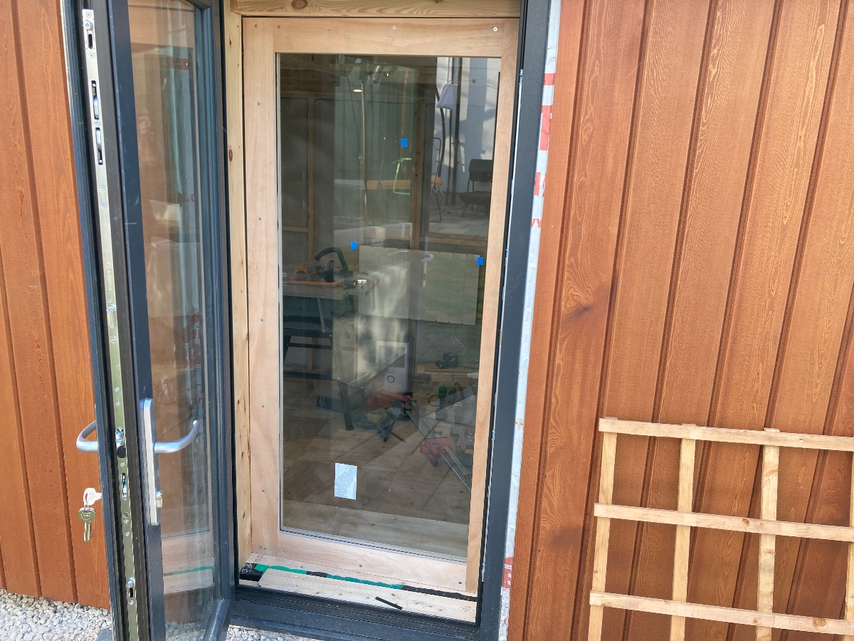 The revised design is to create a wooden frame 100mm wide to surround the 11.5mm glass that will be the bulk of the door. This wooden frame will be 3 layers thick of 18mm ply glued and screwed together so basically 54mm thick ply around the perimeter of the door. The plan is for the first and third outer layers will be the same size as each other, with the longer lengths the full height of the door. The middle layer will be less than 100mm wide to allow the glass to sit within the sandwich of wood. Fortuitously the 11.5mm thick glass plus two thicknesses of glazing tape will be about 18mm. The layers will be cut such that the outer layer long pieces overlap the middle layer width piece, if that makes sense! Sorry for the lack of diagram.